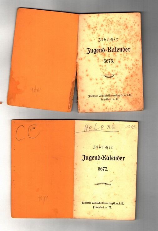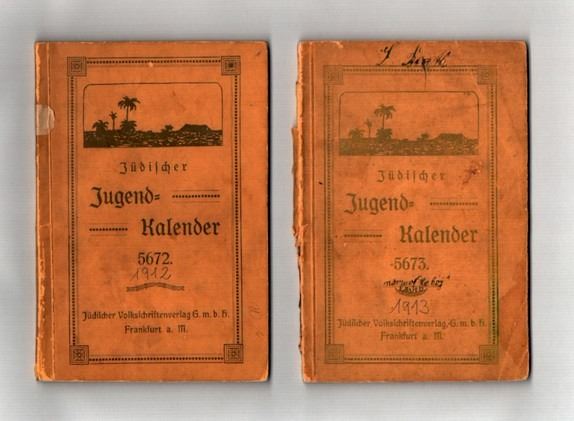 Lot of 2 German-Jewish calendars, 1912-1913, Jugend Kalender, Judilcher Volksschrifftenverlag publishing, Frankfurt. Gilt-embossed bindings. The inner page headings are decorated with designed Jewish symbols. Reasonable condition: worn bindings, interior: foxing on some of the pages, one missed the back cover.