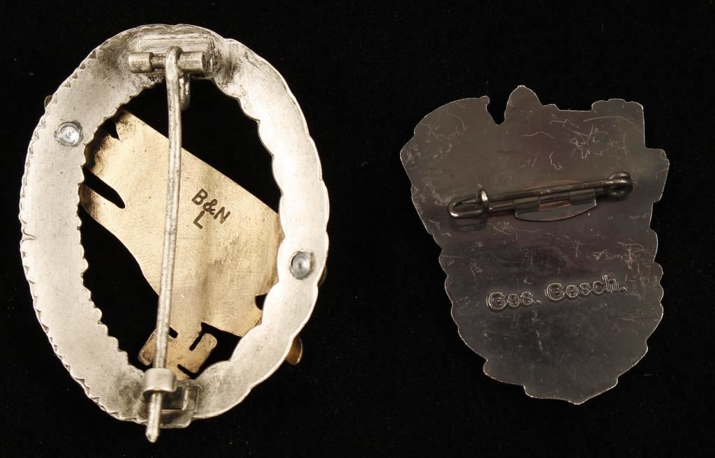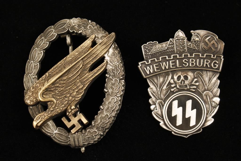 (1) Waffen SS Wewelsburg Castle Badge-maker marked '529 SS', has a thin horizontal pin back, nickel construction with black enamel. (1) Luftwaffe Paratrooper Fallschirmjager Jump Badge-maker marked 'B&NL', has a thin vertical pin back, two piece tow domed brass and nickel construction. Offered "as is", we don't guarantee the authenticity of this item, please do your research. All sales are final.