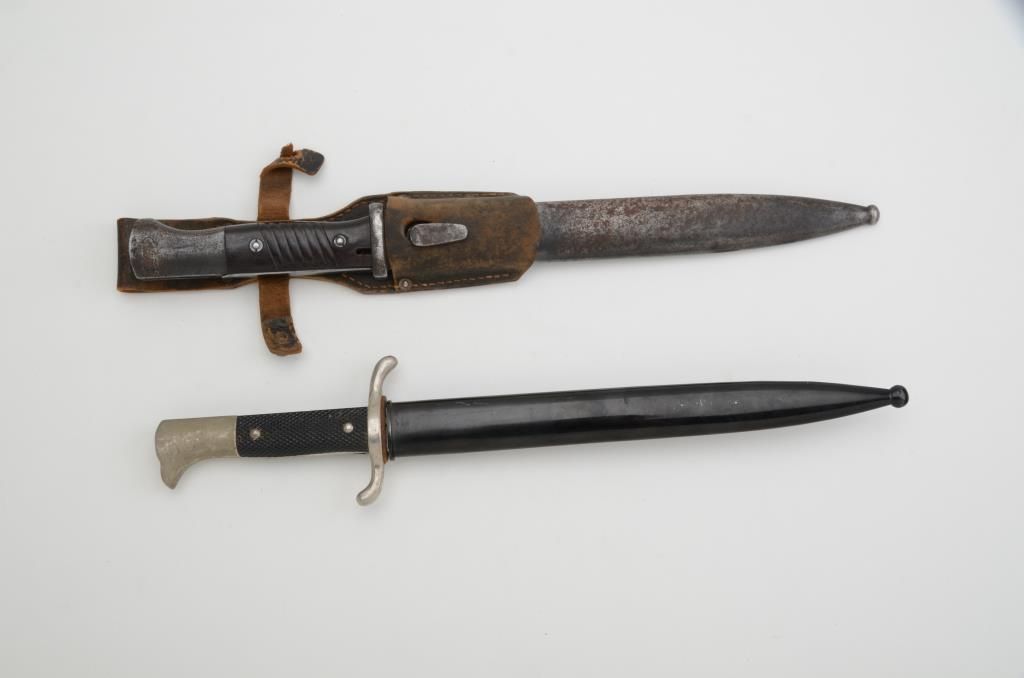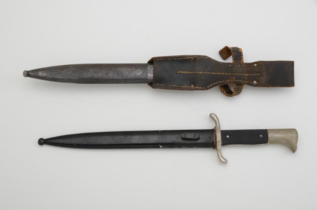 Lot of 2 German bayonets including one Eickhorn Solingen marked with near fine blade and metal sheath displaying the majority of original black finish; the other dated 1942 and numbered 9509 g with metal sheath andleather frog, both in fair condition; bayonet is overall good showing some sharpening but overall good. Est.: $150-$300.