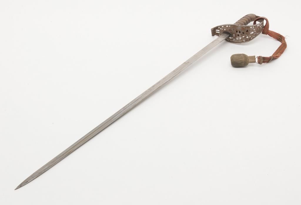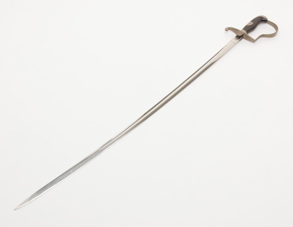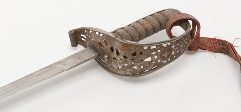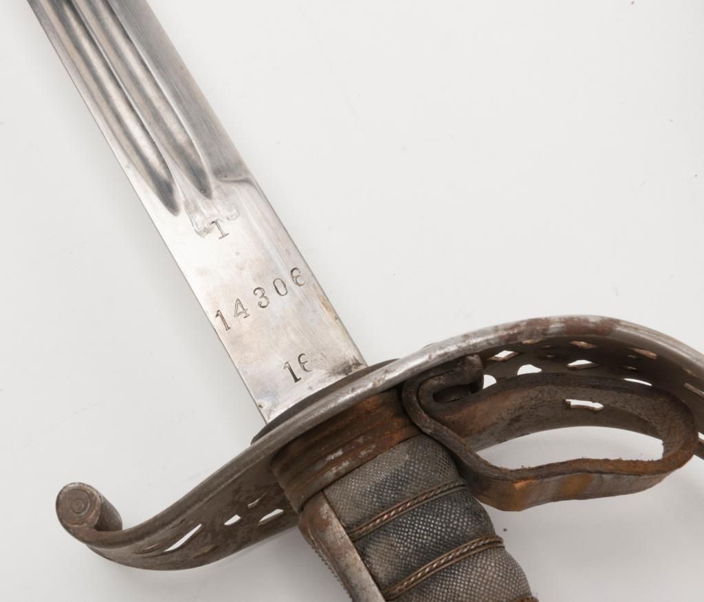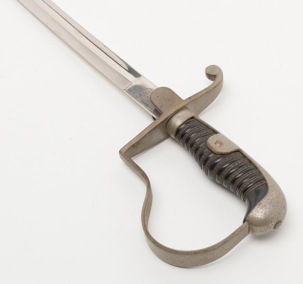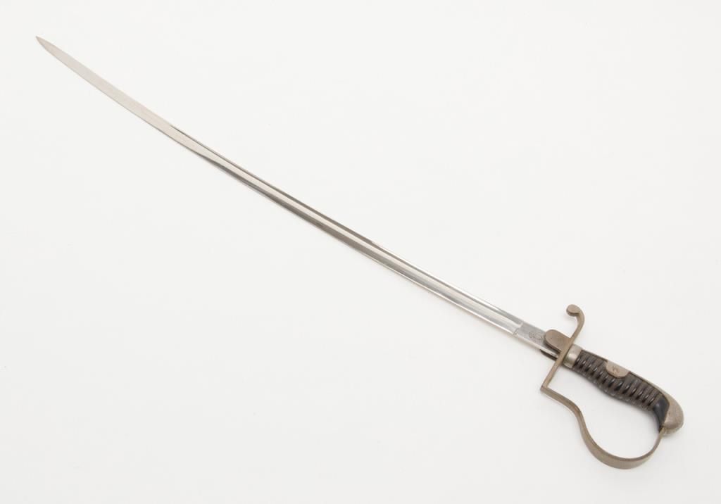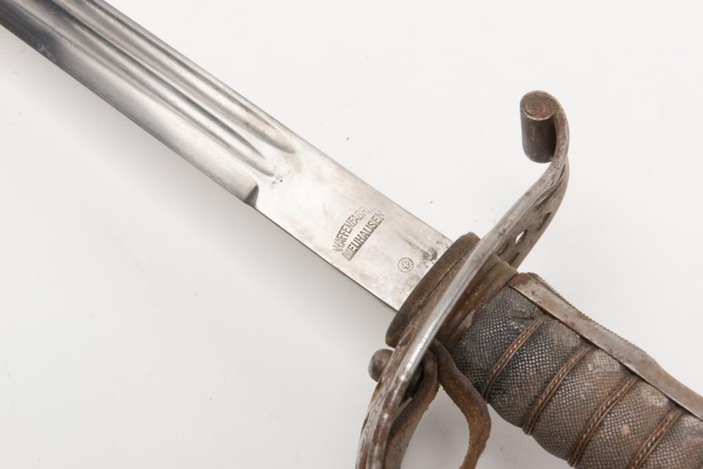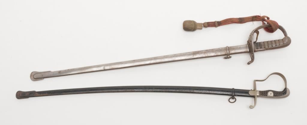 Lot of 2 German swords with scabbards including a “C” guard marked “WAFFENFABRIK NEUMAUSEN” with wire wrapped rayskin grip and metal scabbard in overall good condition with hanging knot and a Paul Weyersberg & Co., Solingen plain blade withmetal scabbard displaying a fine blade and fair to good scabbard showing areas of surface rust from storage. Est.: $300-$600.