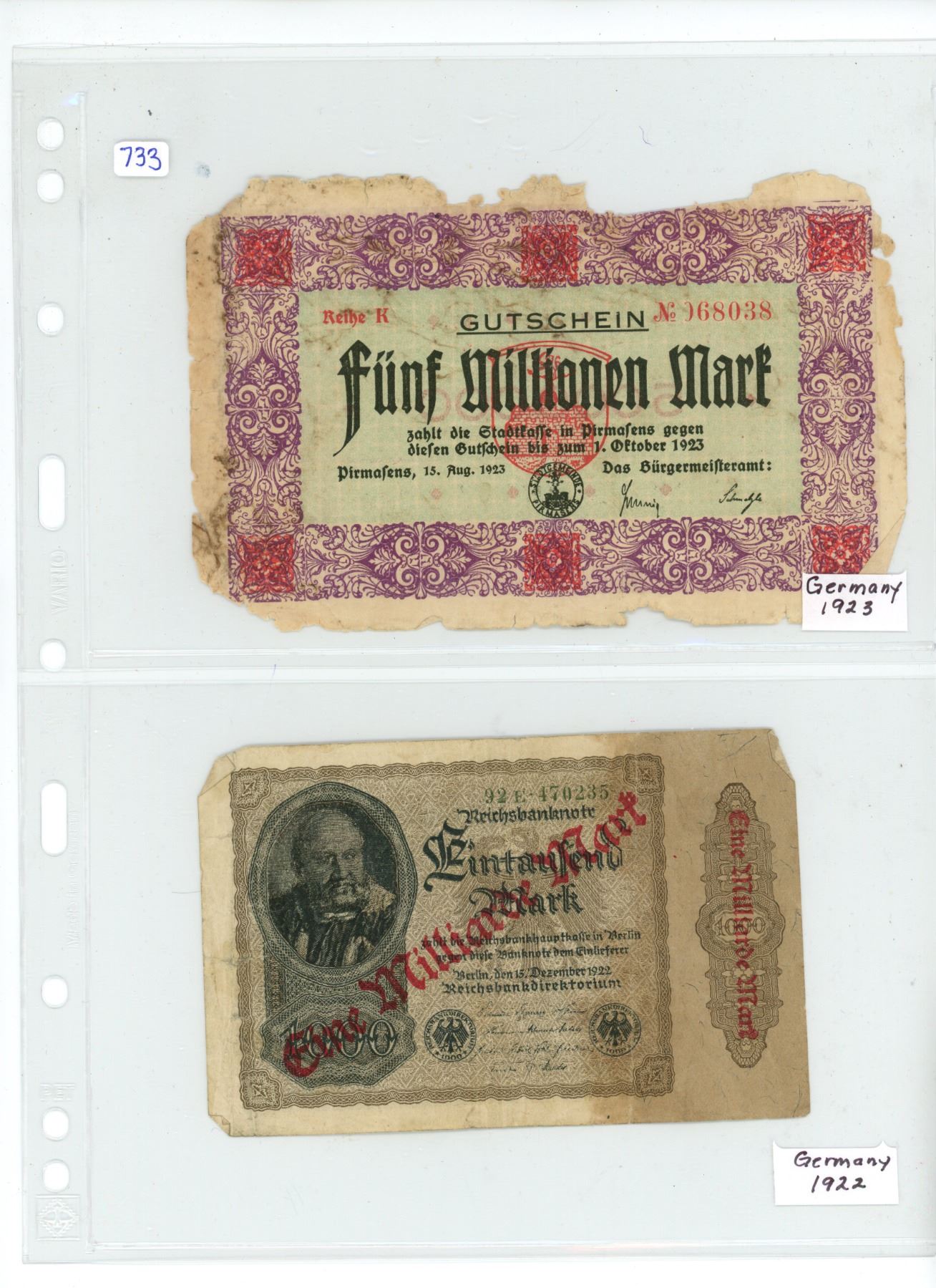 Lot of 2 Germany banknotes: 1923 Five Million Mark & 1922 One Million Mark