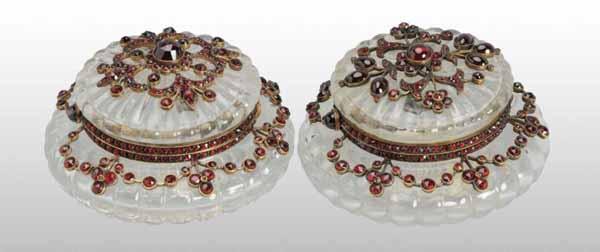 Description Possibly Austrian. Both jars are in 800 silver with hinged top and different garnet designs but still matching. Condition (Excellent). Size 2 - 1/2".