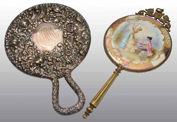 Description One with an enamel painting of a lady and man in the woods with a beveled mirror. Second is a floral patterned mirror, some darkening of the mirror. Condition (Excellent). Size 9" L., Mirror: 4" Dia.