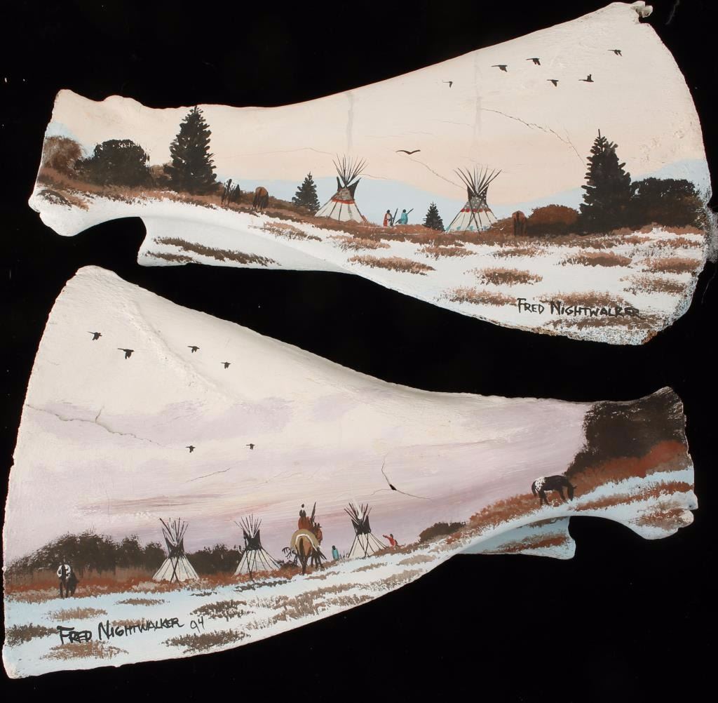 Bison Shoulder Bone by Fred Nightwalker depicting an Indian tipi village. Each measure approx. 13"x8".