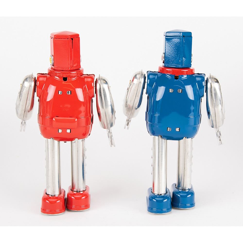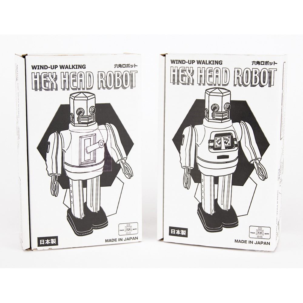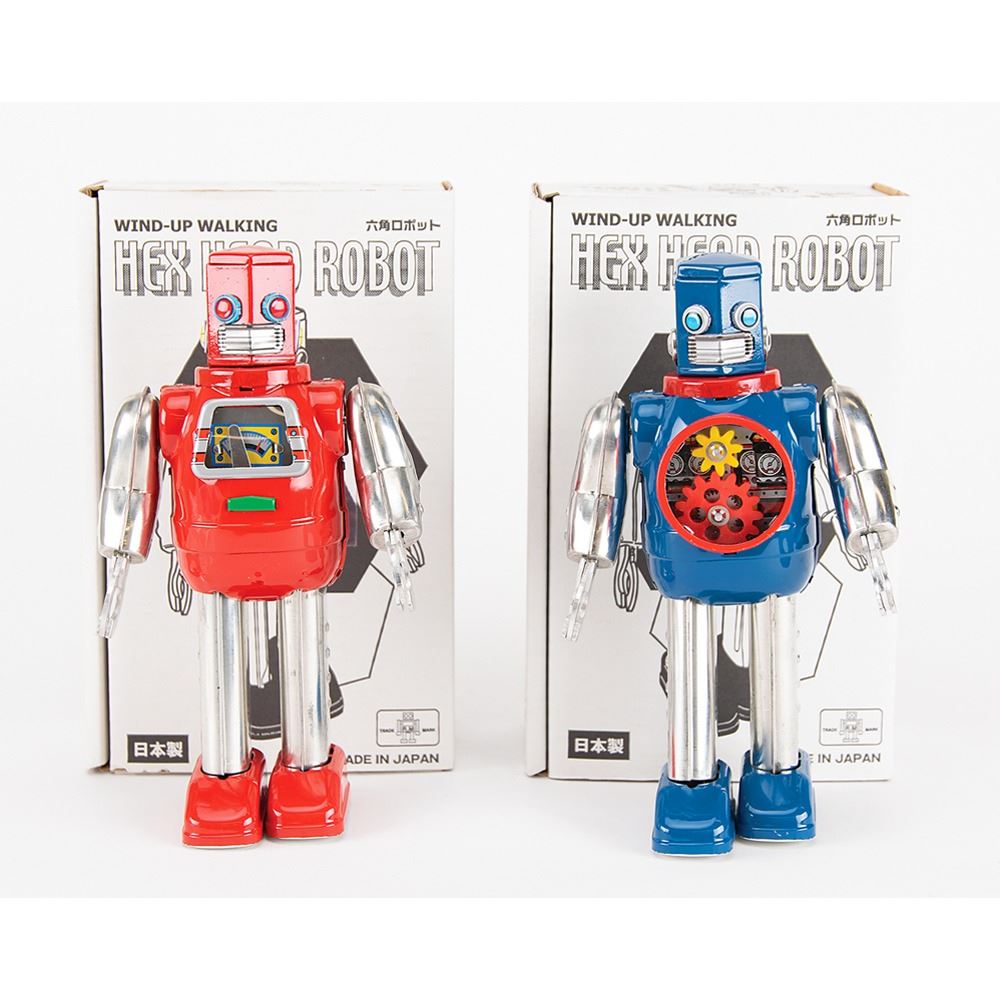 Two delightful circa 2000s wind-up "Hex Head Robot" walking toys, made in Japan by Metal House, each standing at 9Àù tall. Includes one blue-and-silver robot and one red-and-silver robot, both with gears in their chests that spin as they walk. Accompanied by both original boxes and winder keys. A wonderful pair of high-quality clockwork robots.