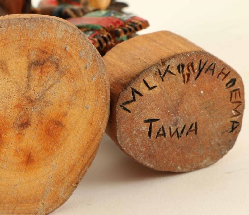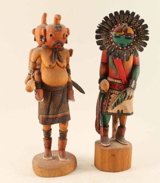 (1) Sunface with rattle and feather carved of a single piece of wood and painted with fine detail, signed by artist on bottom. Measures 8 1/2"h x 2 1/2" x 2". (1) Mudface giving a piggyback ride to another, both are holding a feather and a rattle. Carved of a single piece of wood and painted. Measures 8 1/4"h x 3". Very whimsical piece.