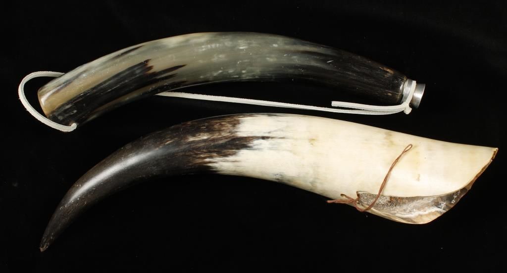 One is a plain decorative cow horn. The other has a mouthpiece and can be used to make sound.