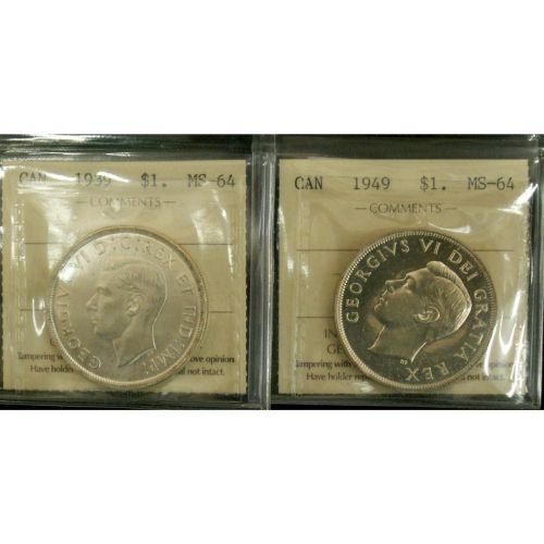 Lot of 2 ICCS graded $1; 1939 MS-64, 1949 MS-64,