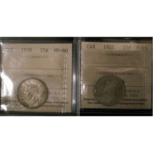 Lot of 2 ICCS graded 25¢; 1921 F-15, 1939 MS-60