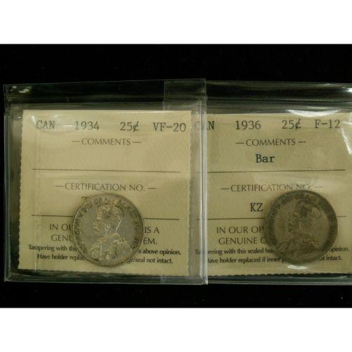 Lot of 2 ICCS graded 25¢ , 1934 VF-20, 1936 Bar Fine-12