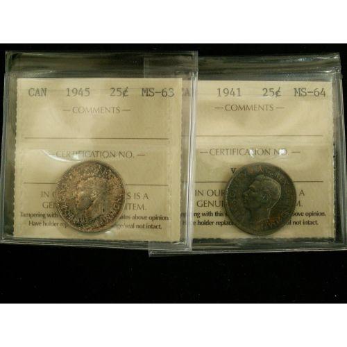 Lot of 2 ICCS graded 25¢; 1941 MS-64, 1945 MS-63,