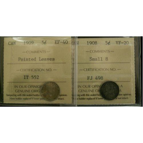 Lot of 2 ICCS graded 5¢; 1908 small 8 VF-20, 1909 Ptd Lvs EF-40,