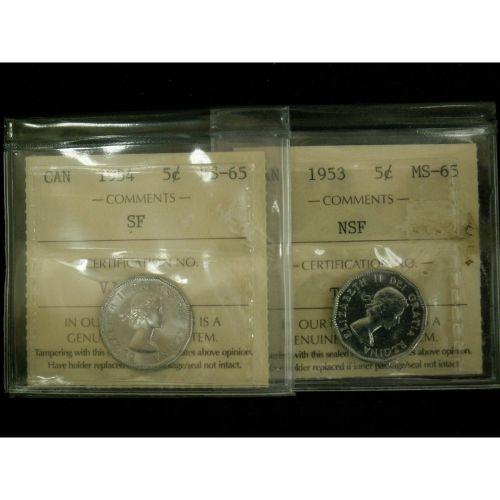 Lot of 2 ICCS graded 5¢, 1953NSF MS-65, 1954