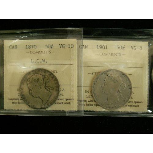 Lot of 2 ICCS graded 50¢ 1870 LCW VG-10, 1901 VG-8,