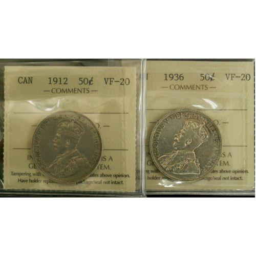 Lot of 2 ICCS graded 50¢ 1912 VF-20, 1936 VF-20,
