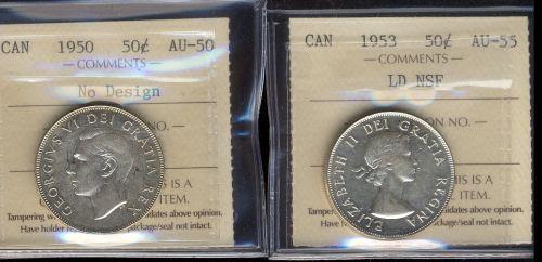 Lot of 2 ICCS graded Fifty cents; 1950 No Design AU50, 1953 LDNSF AU55.