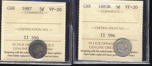 Lot of 2 ICCS graded Five cents; 1883H,1887. Both VF20