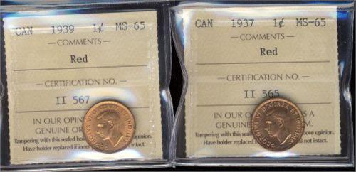 Lot of 2 ICCS graded Small cents; 1937, 1939. Both MS65 Red.