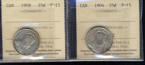 Lot of 2 ICCS graded Twenty-five cents;1904, 1908. Both F15