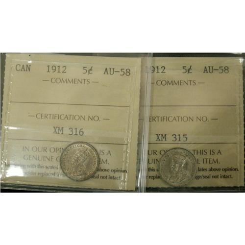 Lot of 2 ICCS grded 5¢;1912 AU-58 (2).