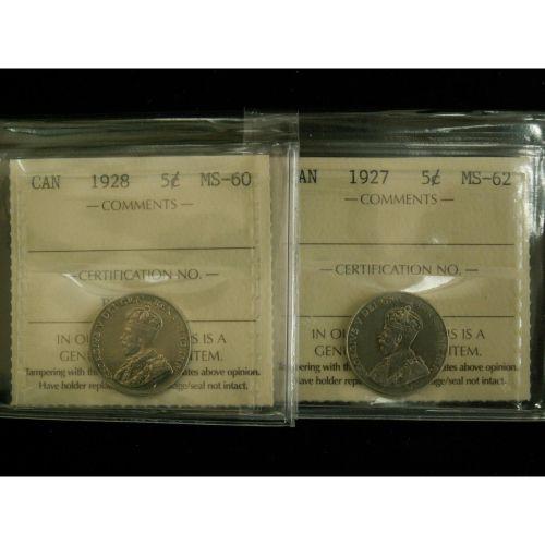 Lot of 2 ICCS grded 5¢ ; 1927 MS-62, 1928 MS-60,