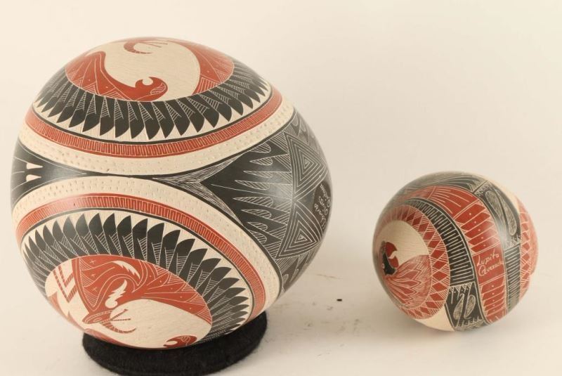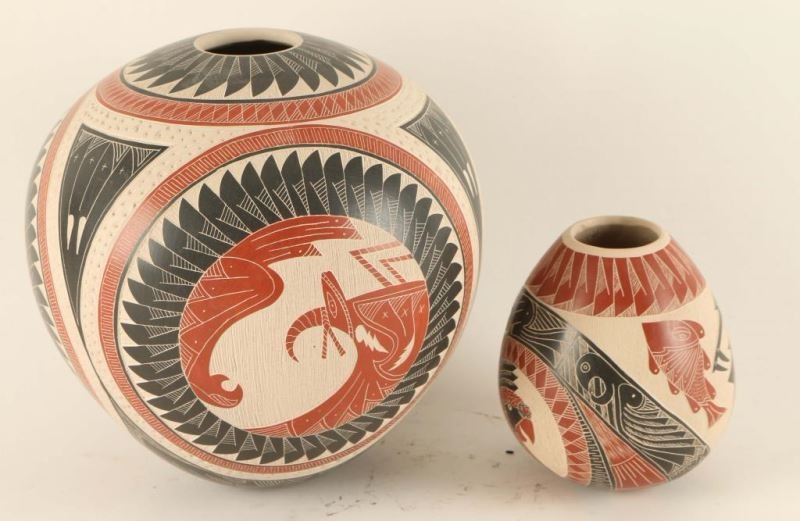 Larger pot has striking feather and wave design and measures 7"h x 6 1/2"dia. Signed E Eduardo Olivas Quintana'. Smaller pot has parrot, serpent and fish motif and measures 4 3/4"h x 3 1/2"dia. signed 'Lupita Quezada'.