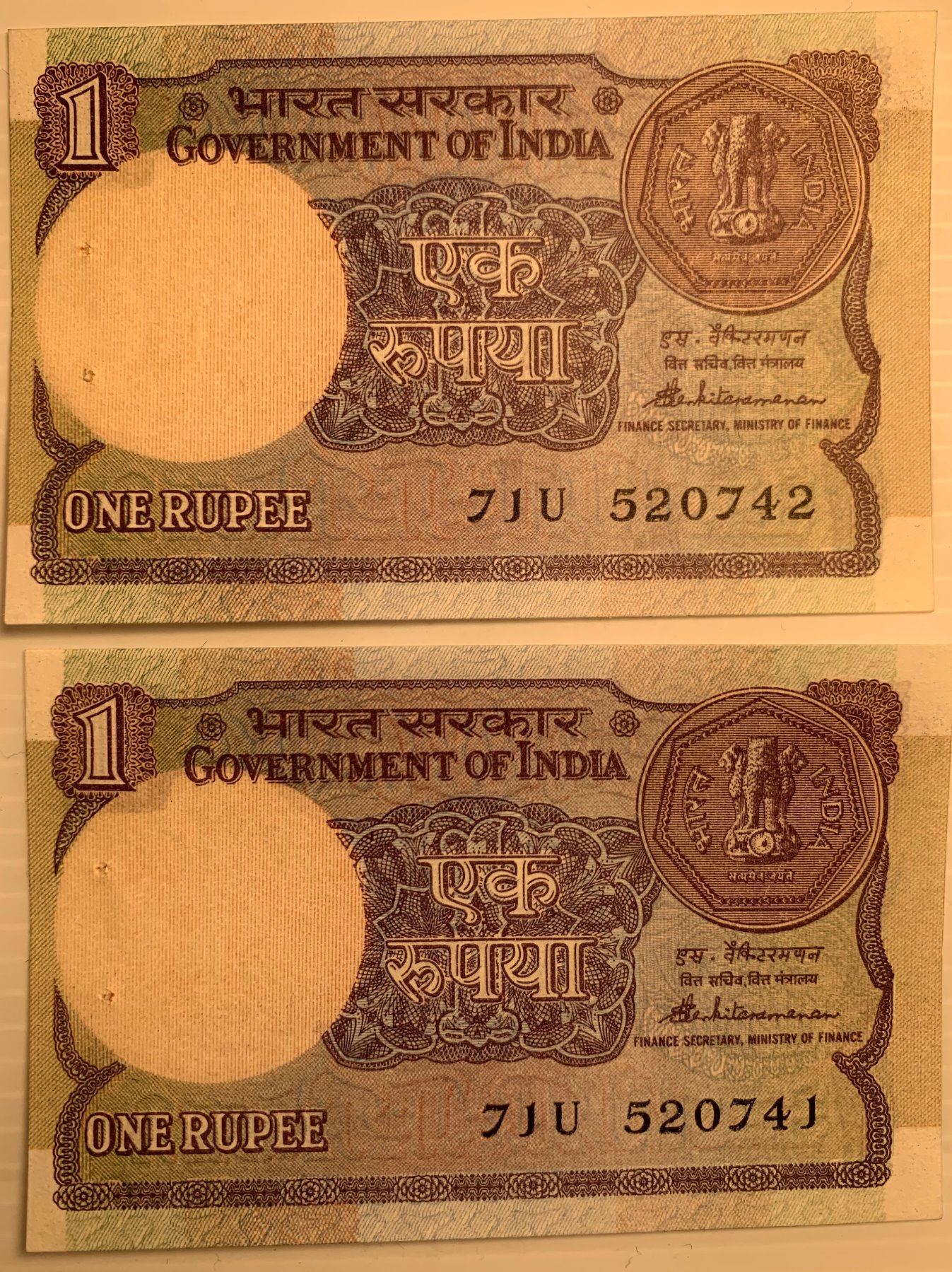 Lot of 2 India 1 Rupee 1989 P78A/d UNC with holes Sequential Serial 520741 to 520742