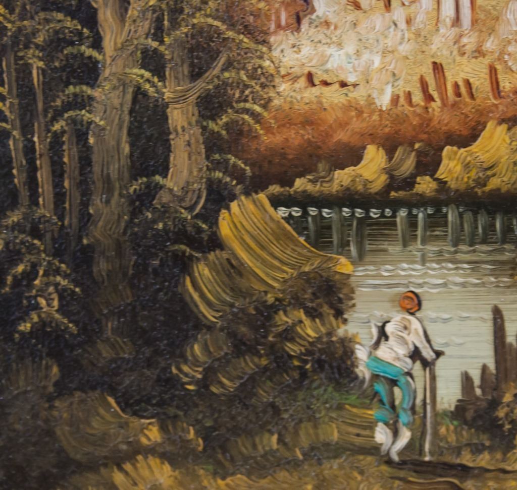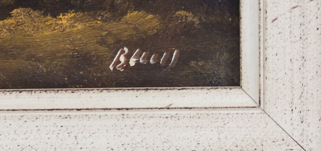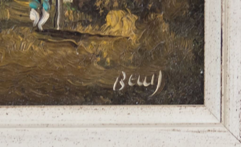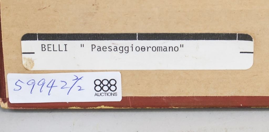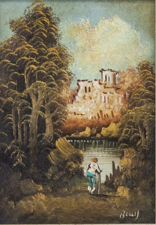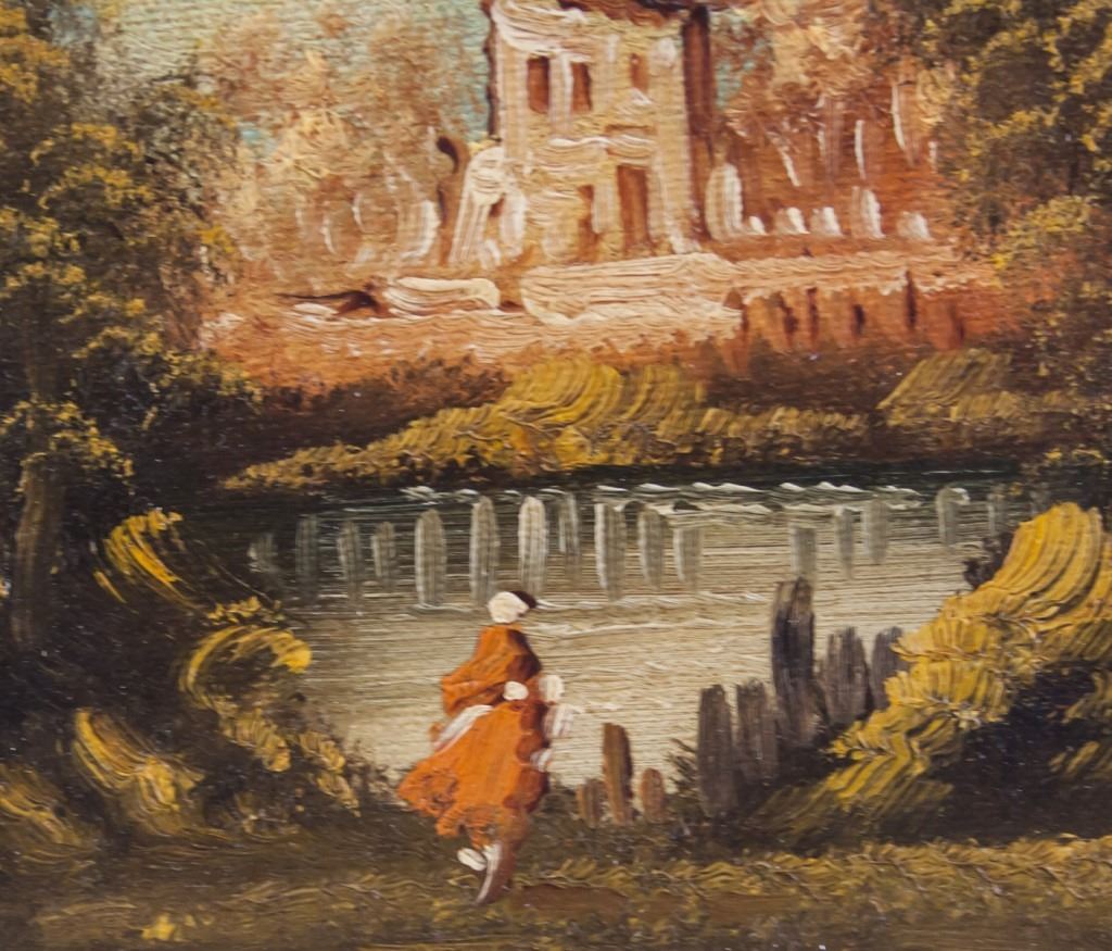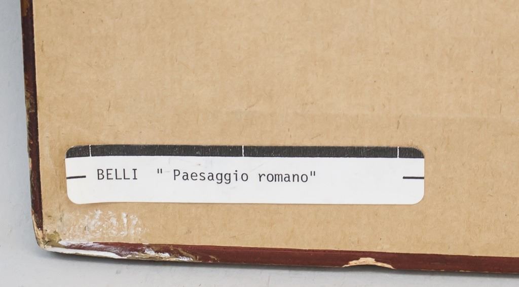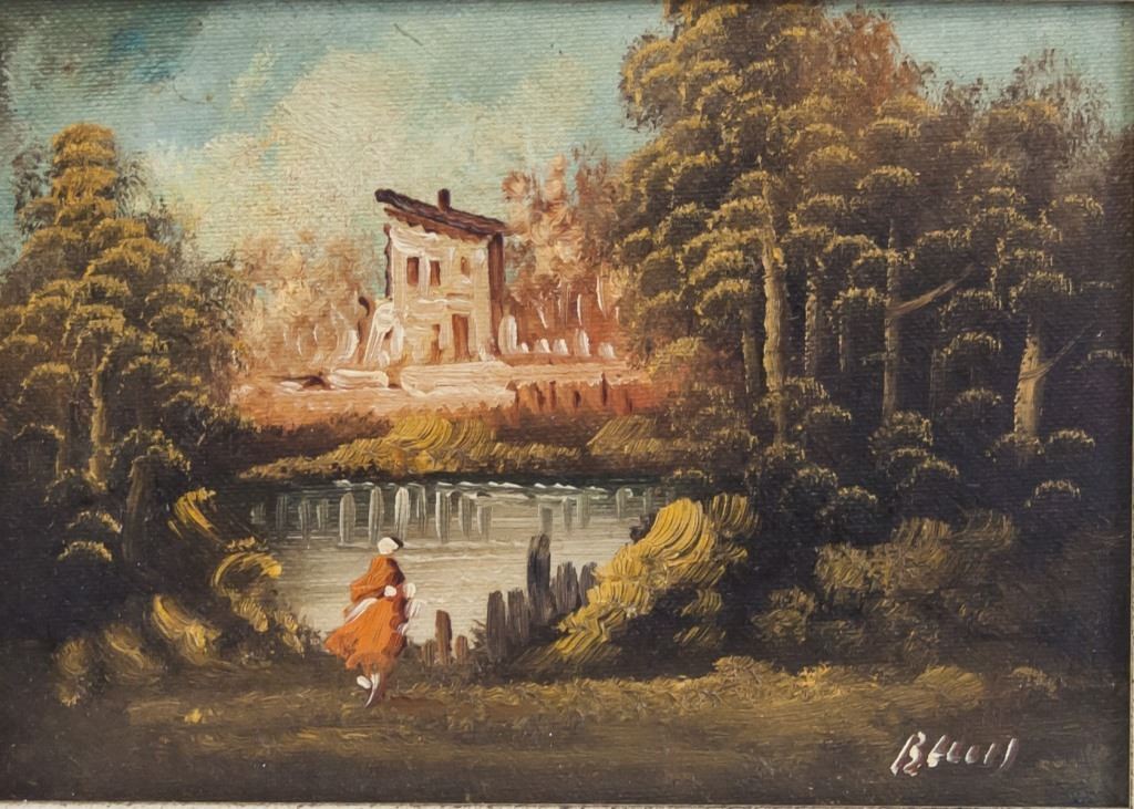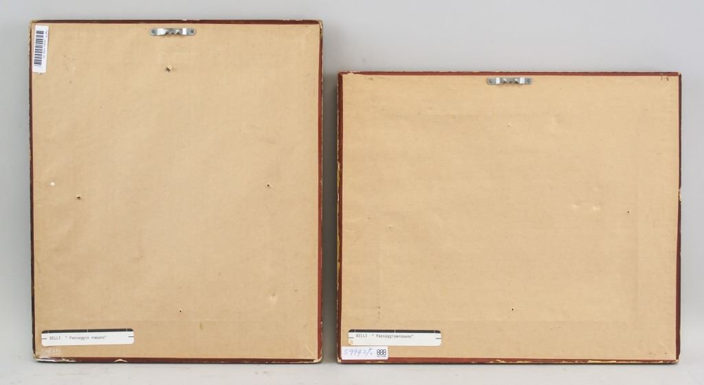Lot of two (2) oil on panels, framed. Featuring similar landscape scenes with a large building in the background, a lake, and a figure standing across the lake close to the viewer. Signed "Belli" in the bottom right corner. Sticker on verso reads "Paesaggio Romano". Panel size: 16.5 x 12 cm (6.5 x 4.5 inches). Frame size: 31 x 28 cm (13.5 x 11 inches).