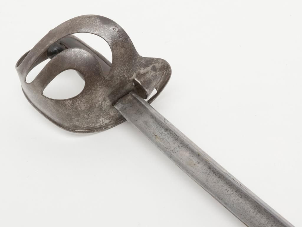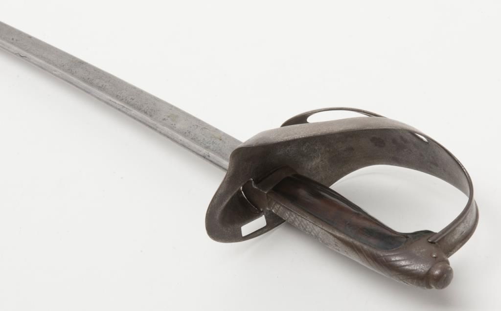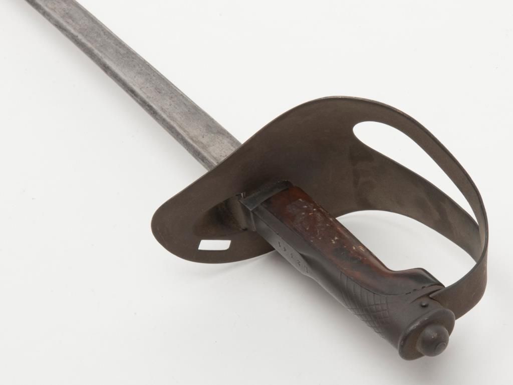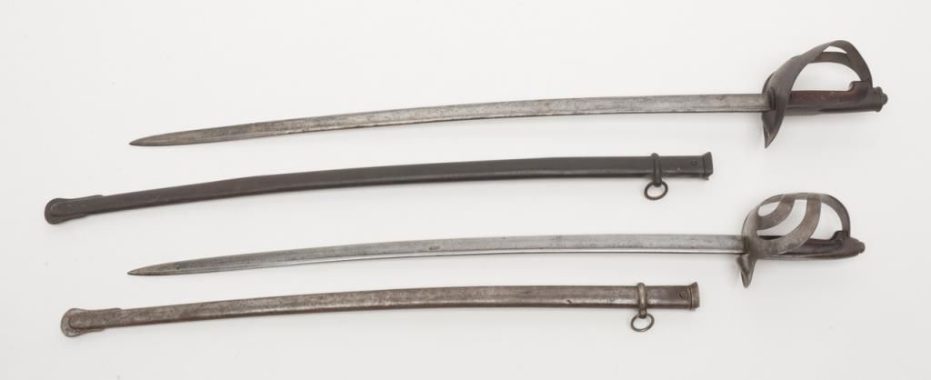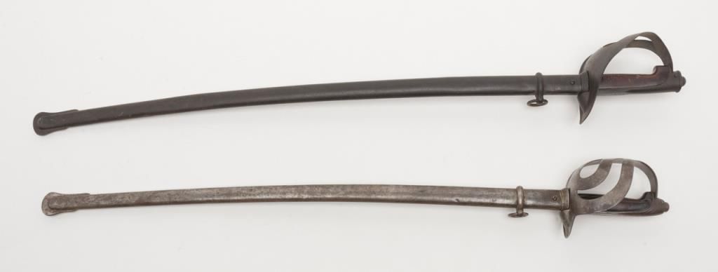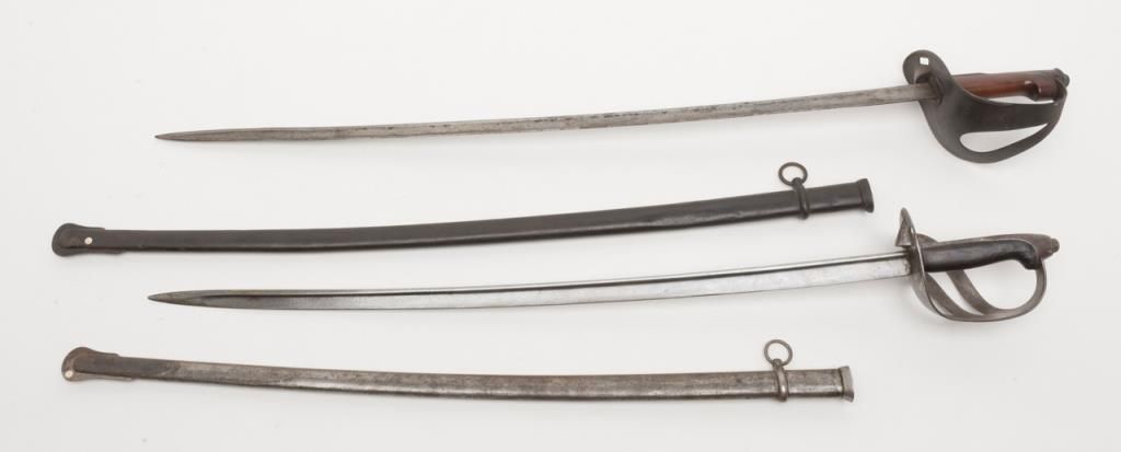Lot of 2 Italian swords with metal scabbards including one approx. 40” overall with a blade marked only with an “A” marking on the hilt, wood grip that is heavily split on the right side, #367 on backstrap of grip; overall good condition with #141 on drag of scabbard; second sword is approx. 43” overall with “MA” marking on the hilt, wood grip and #L2341 on backstrap of grip; overall good condition with heavy patina on scabbard that is also #L2341; some scattered dents to scabbardbody. Est.: $300-$600.