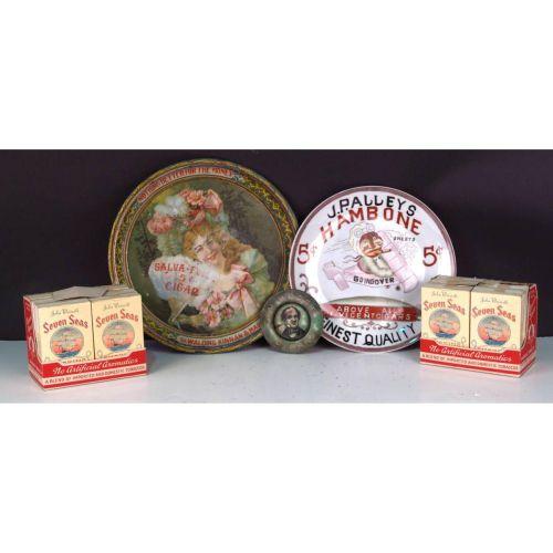 Lot of 2 Items Hambone cigar advertising plate & Group of 2 advertising cigar trays with original boxes of smoking tobacco