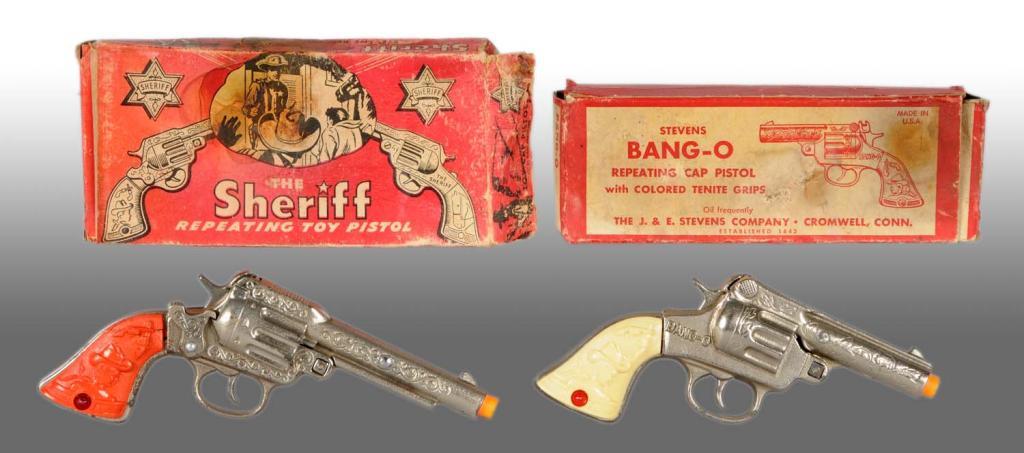 Cast iron with plastic grips. Both are working. Includes a Bang-O and the Sheriff, both with original and complete boxes, but with some staining and wear. Cap Gun Condition (Good - Excellent). Size Largest: 8 - 1/2" L.