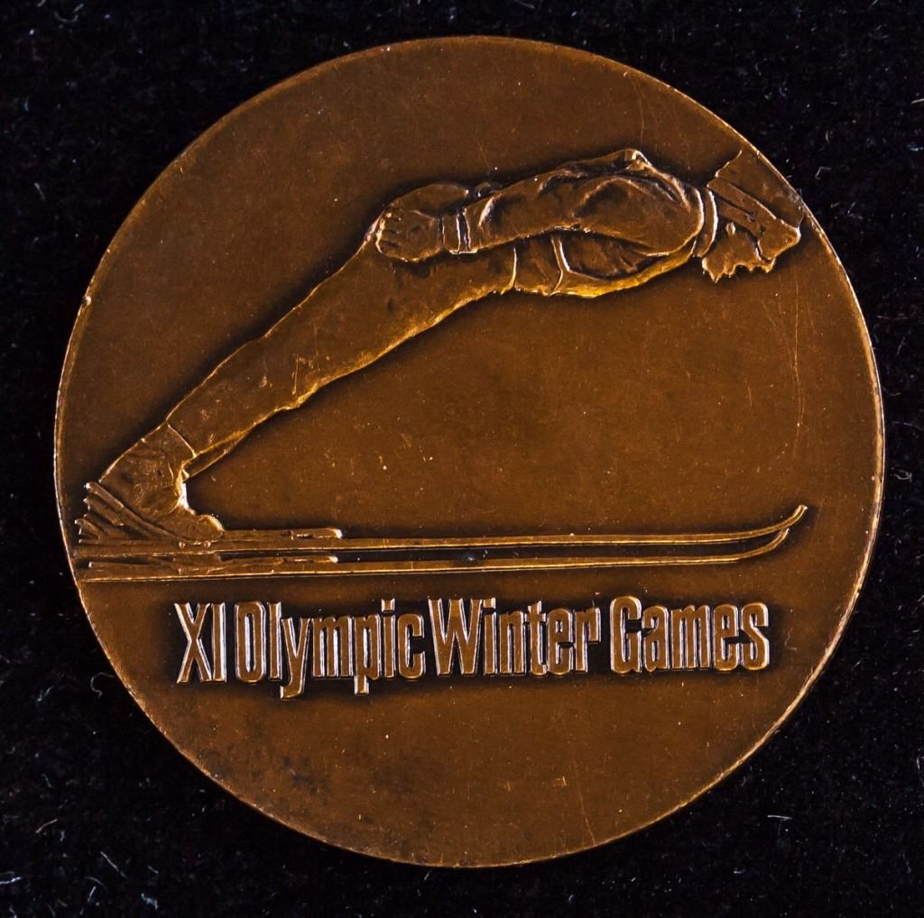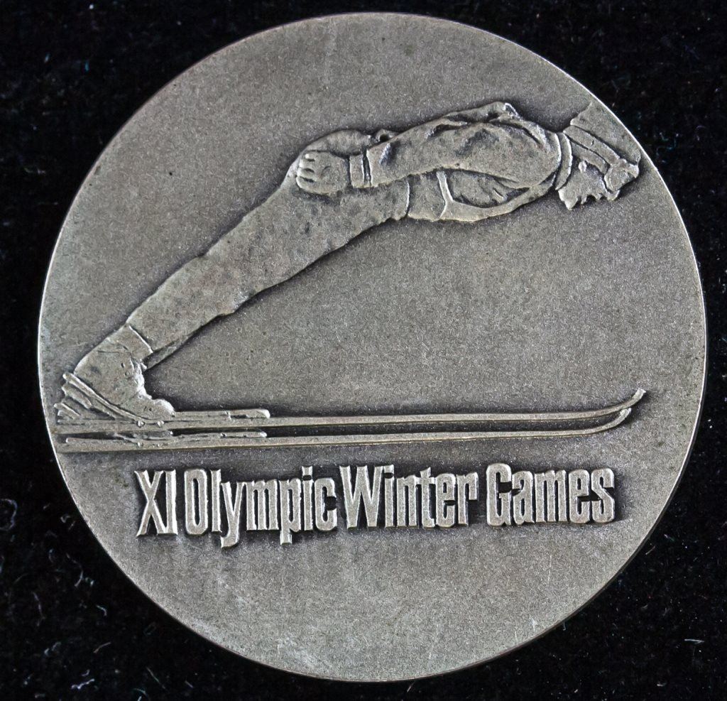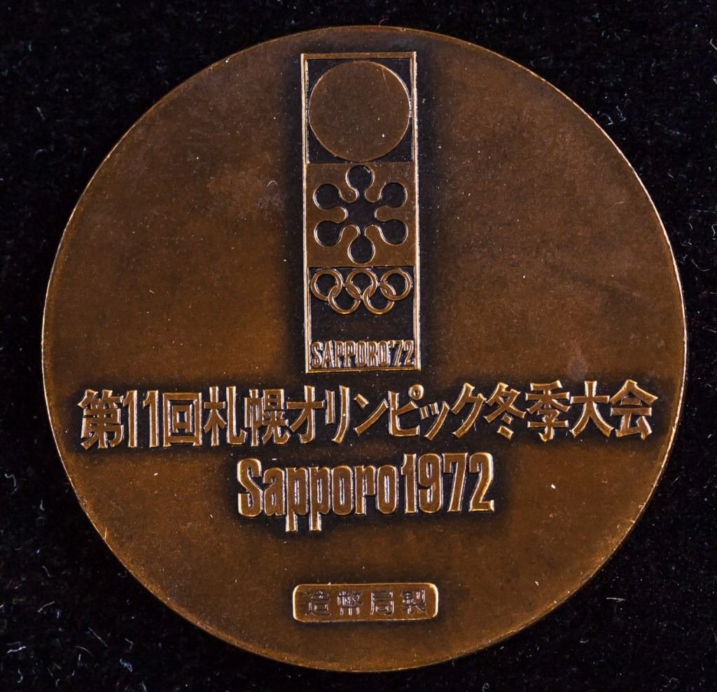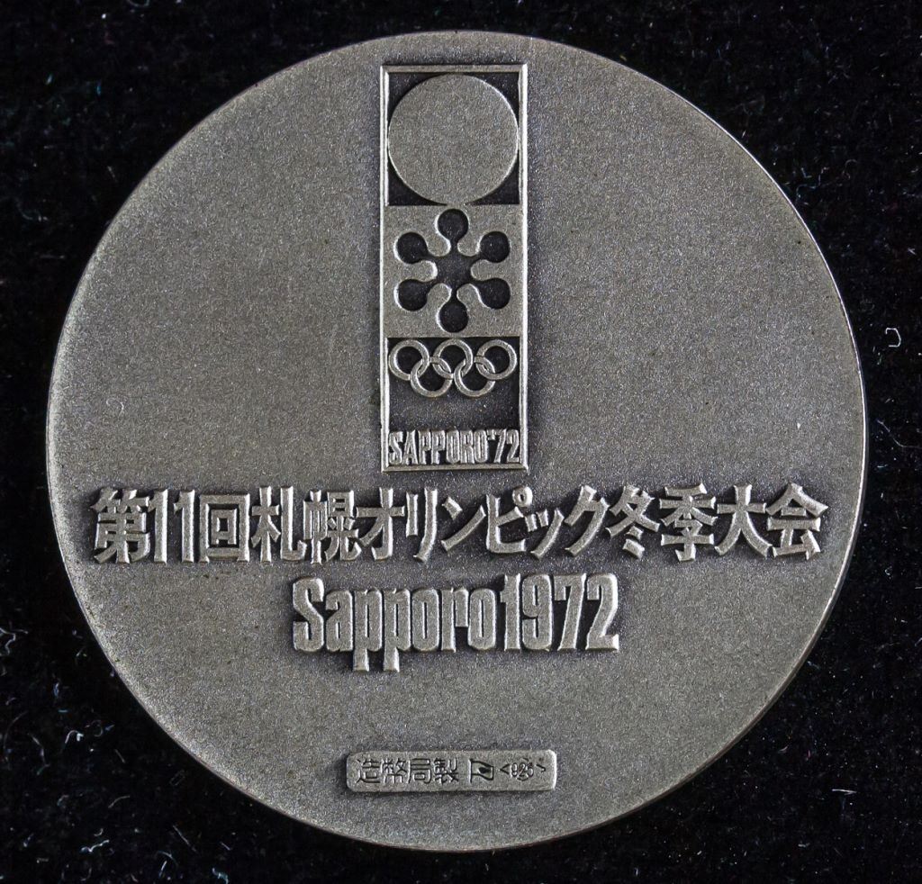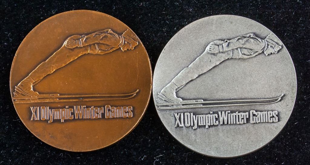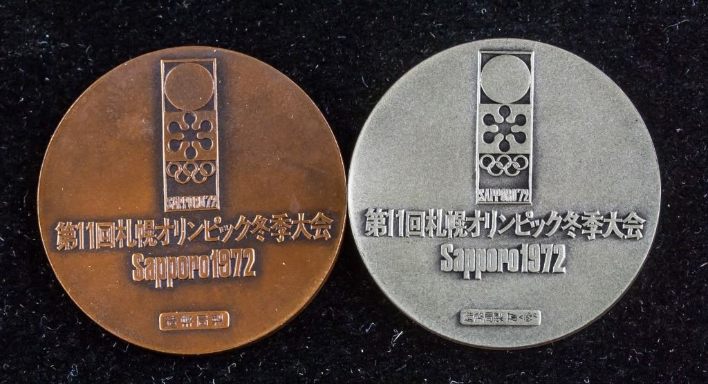 Lot of 2 1972 Japanese Olympic tokens. Featuring ski jumping on one side. Sponsored by Sapporo. Diameter: 3.5 cm. 33 grams (total).