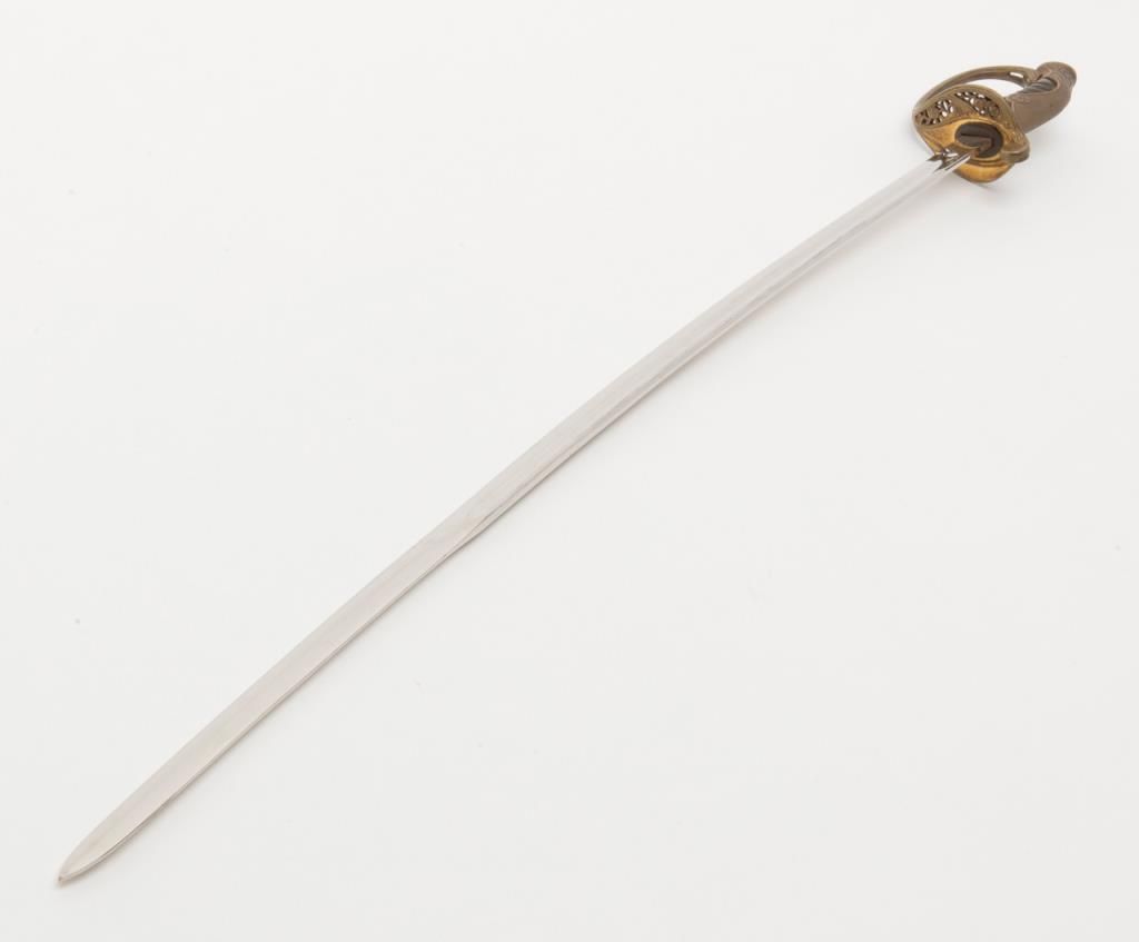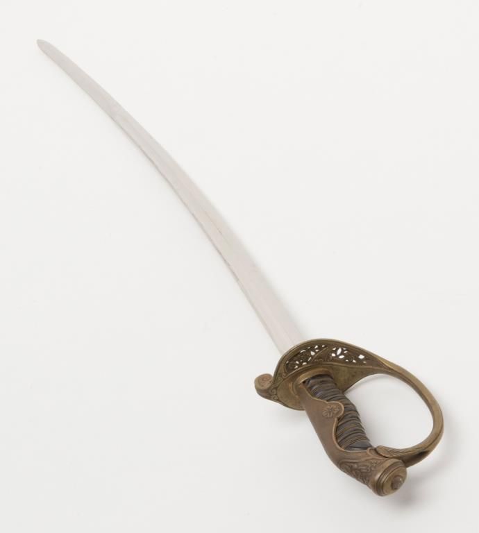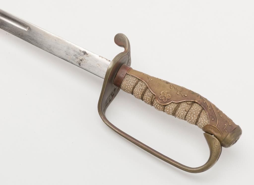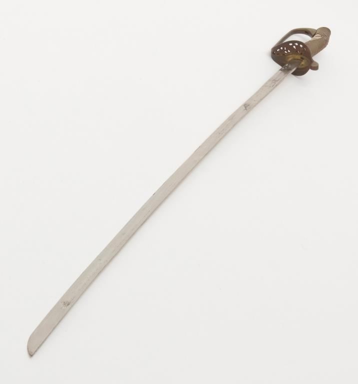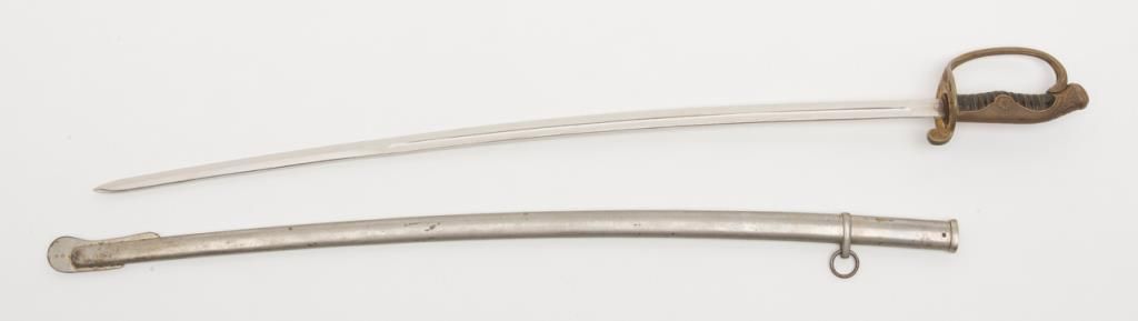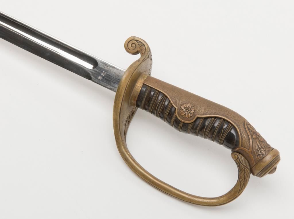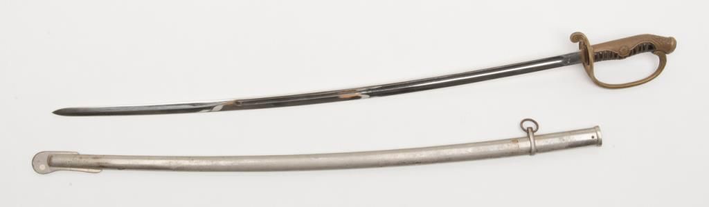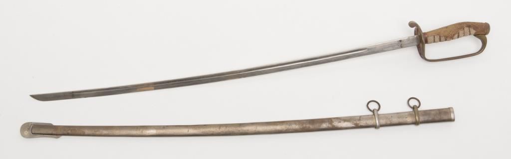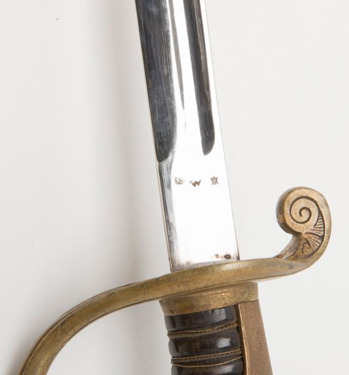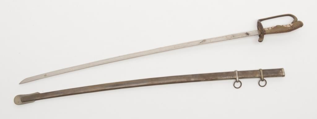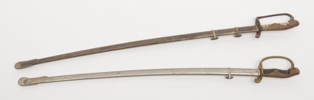 Lot of 2 Japanese military swords and scabbards; first is approx. 36-1/4” overall, very good to fine plain blade, brass guard, wire wrapped bone grip, metal scabbard, one hanging ring; the second sword is approx. 38” overall, fair to good bladewith some spots of erosion, wire wrapped rayskin grip, brass guard and metal scabbard with two hanging rings. Est.: $200-$400.