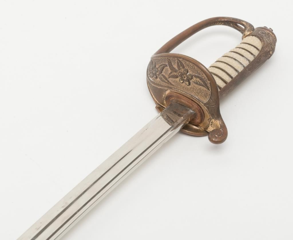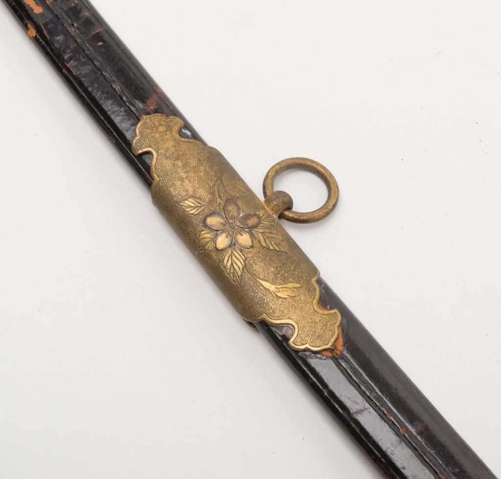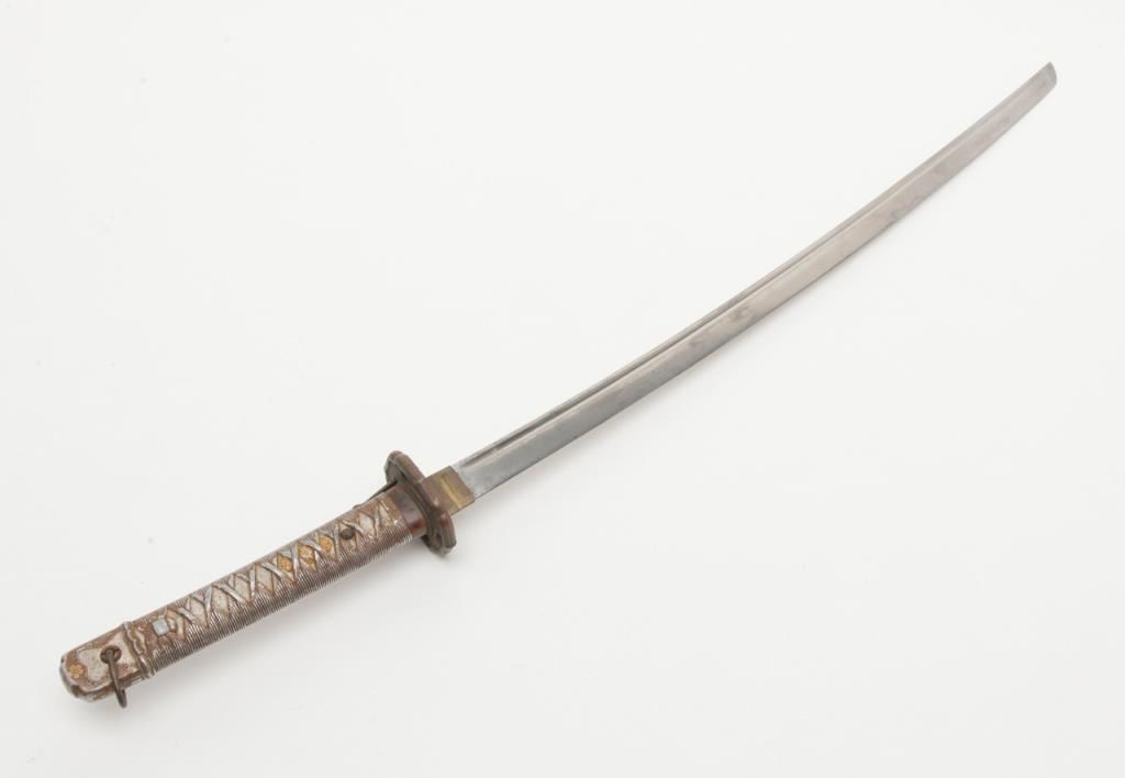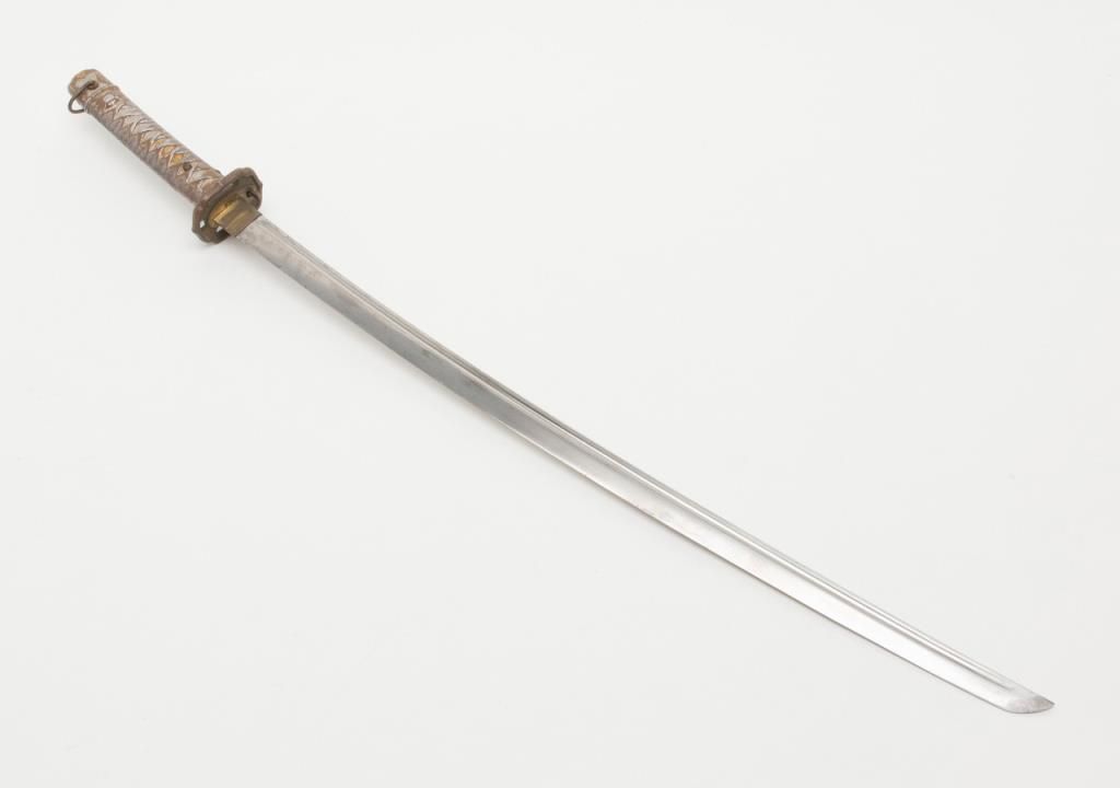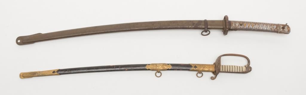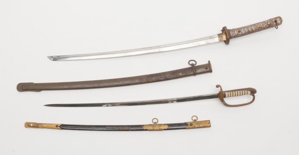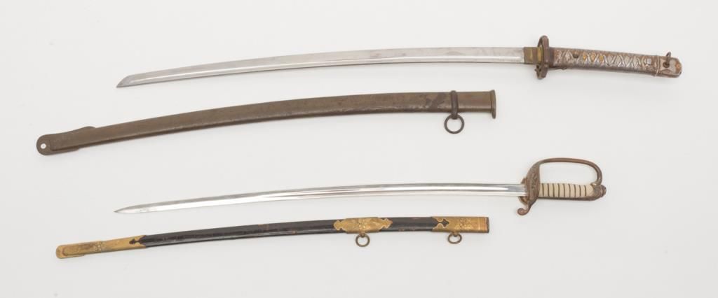 Lot of 2 Japanese swords consisting of an officer’s sword with leather scabbard, brass mounts and wire wrapped rayskin grip in overall good to very good condition and a machine-made officer’s sword, blade #143412 with metal scabbard and integral metal grip in overall good condition. Est.: $200-$400.