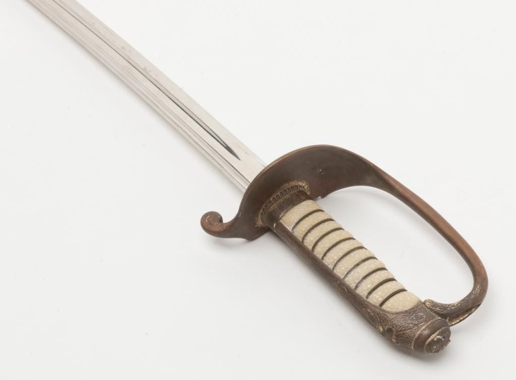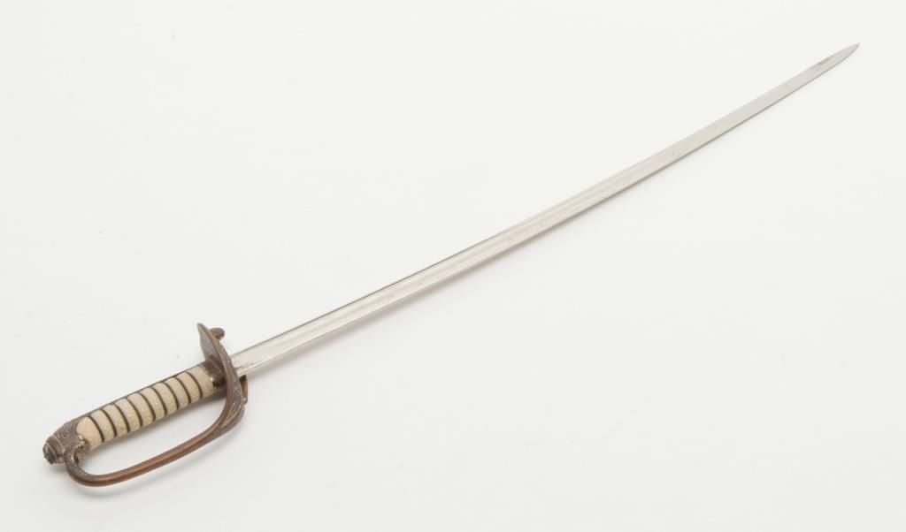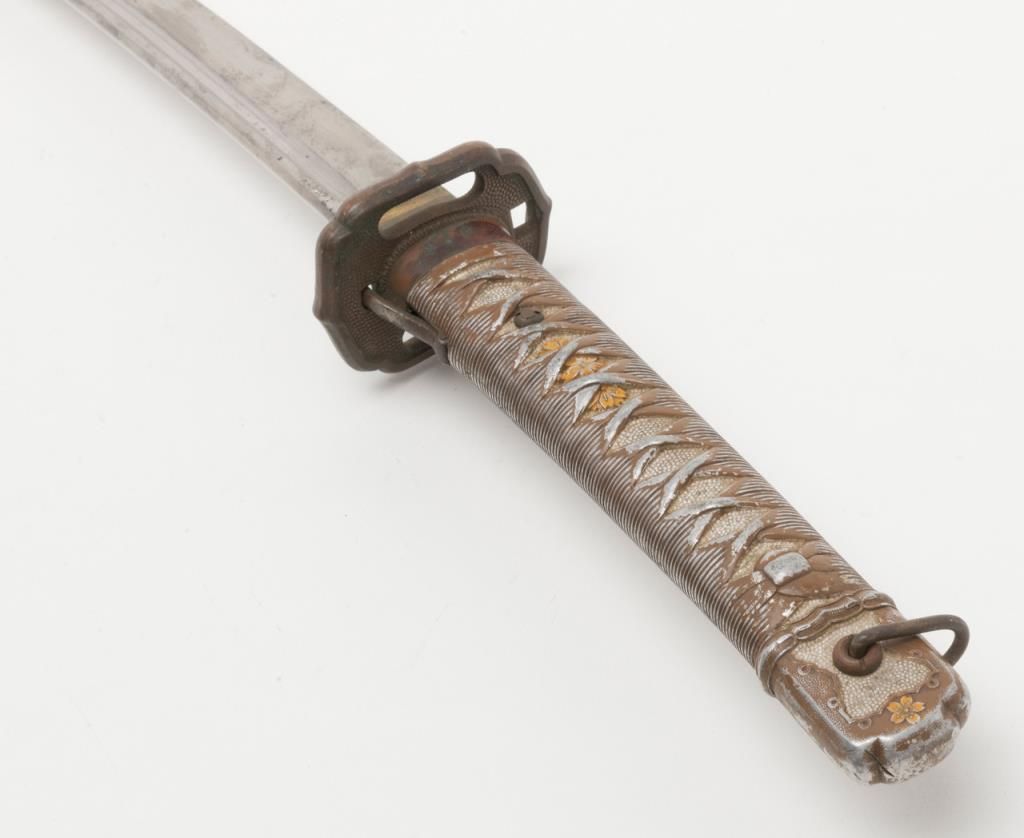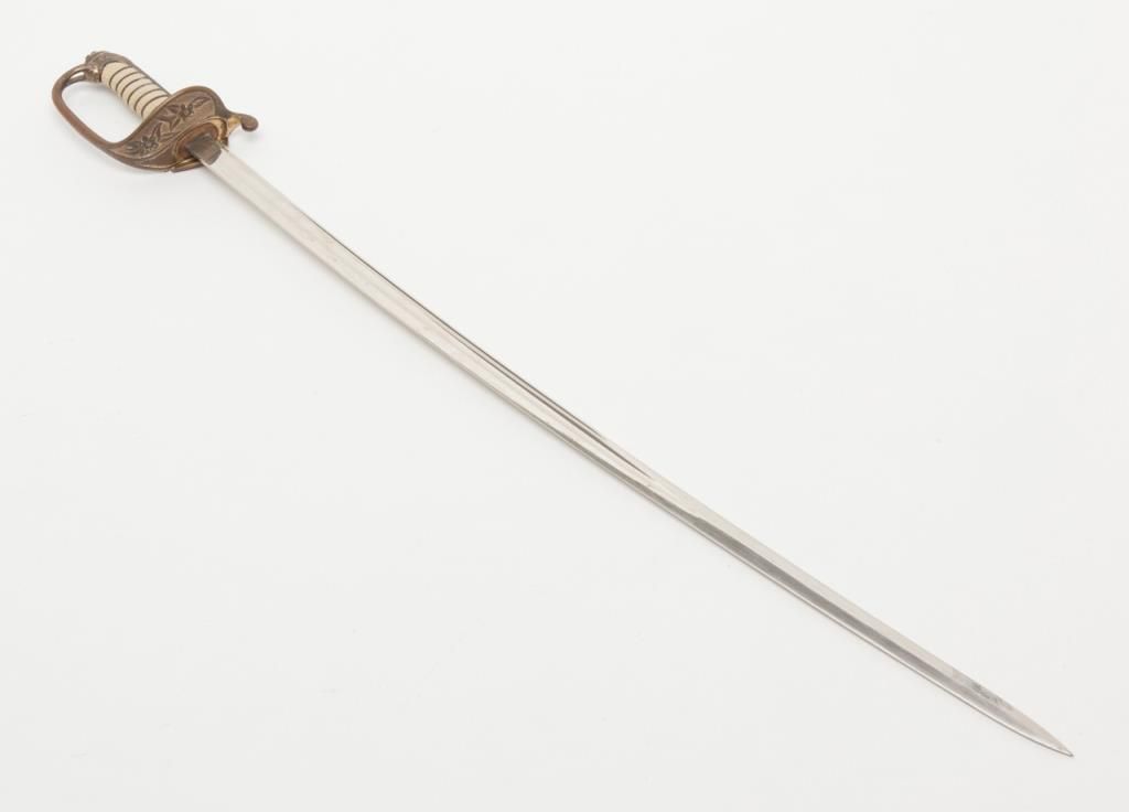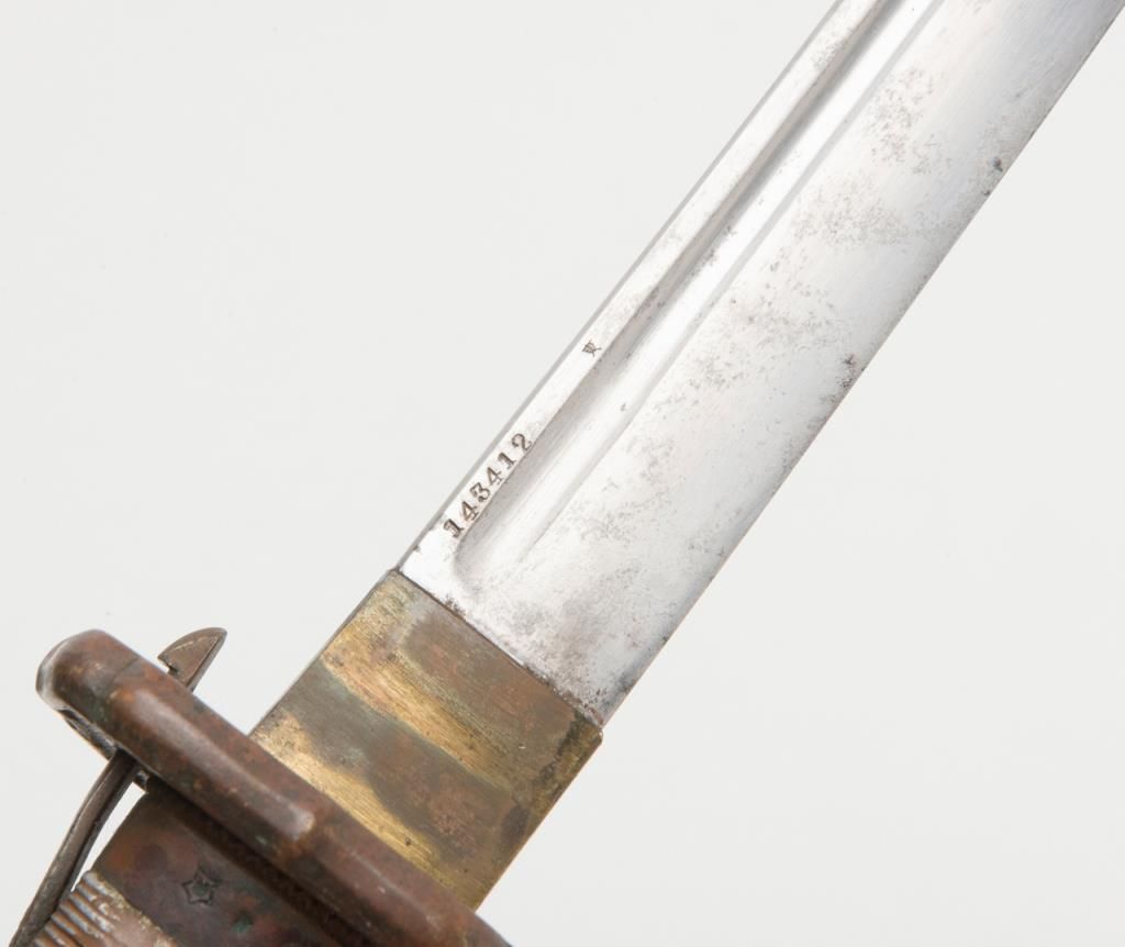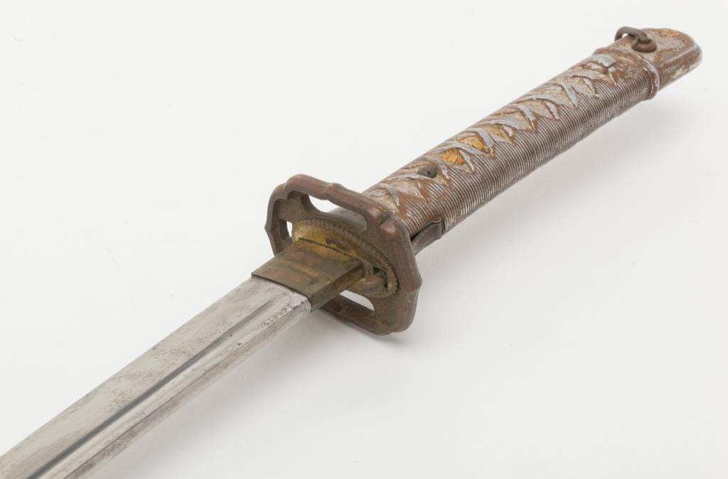 Lot of 2 Japanese swords consisting of an officer’s sword with leather scabbard, brass mounts and wire wrapped rayskin grip in overall good to very good condition and a machine-made officer’s sword, blade #143412 with metal scabbard and integral metal grip in overall good condition. Est.: $200-$400.
