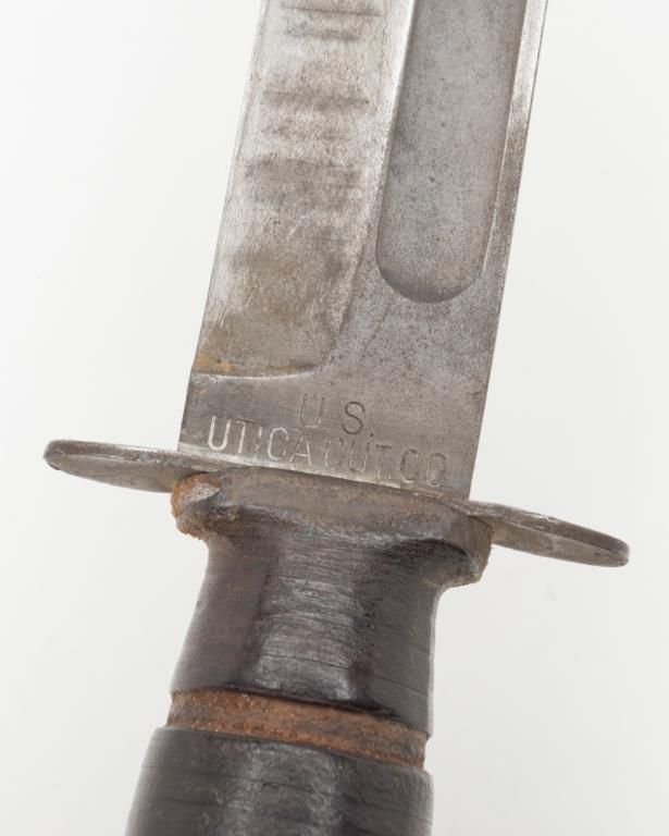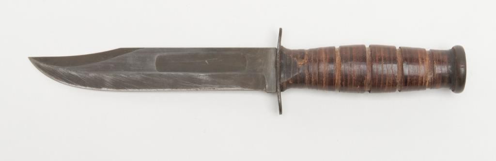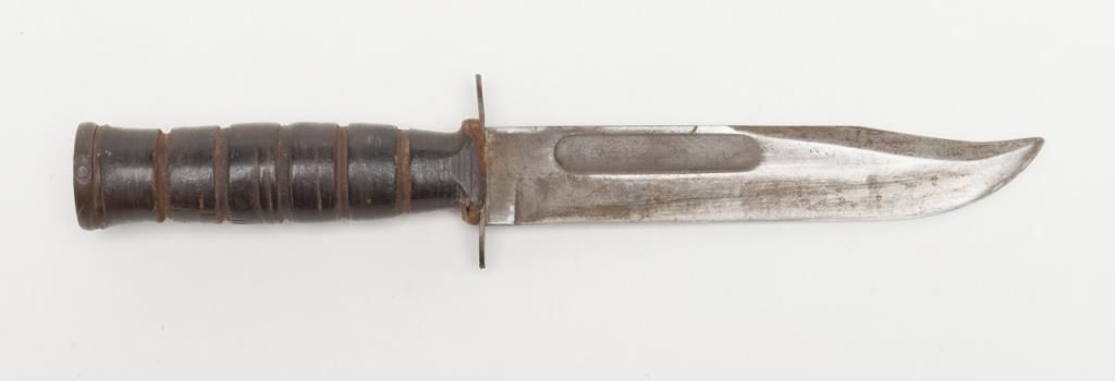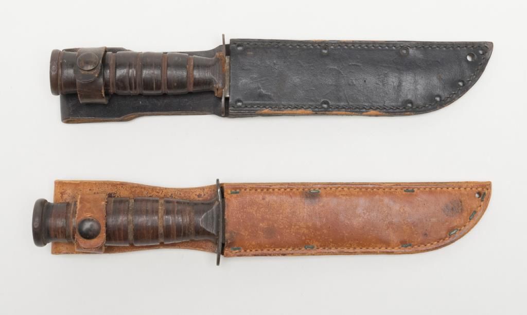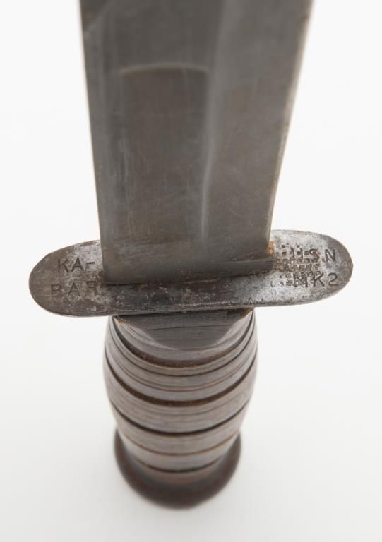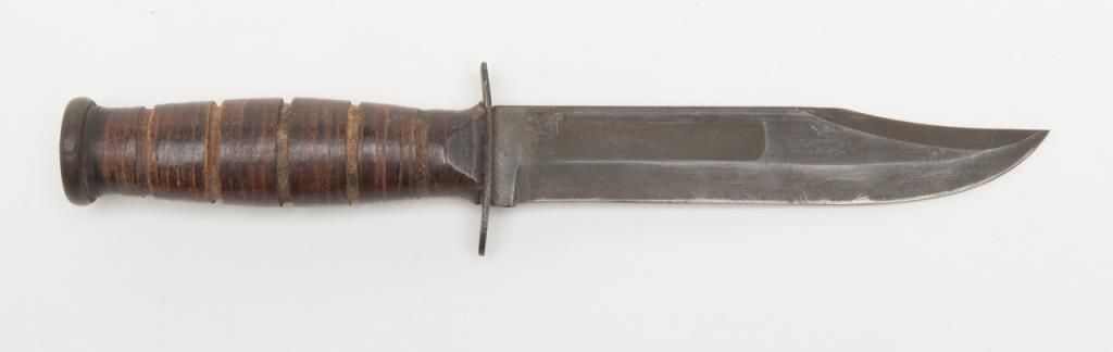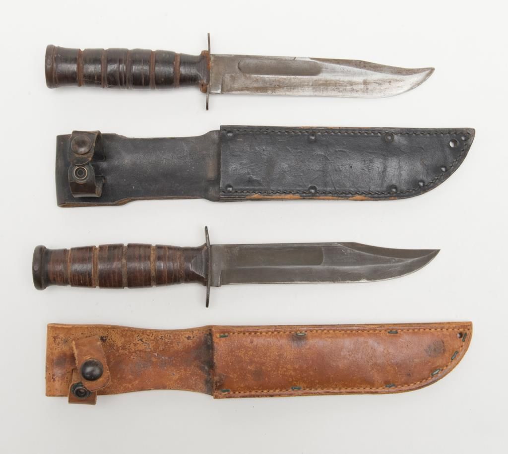 Lot of 2 KA-BAR style knives with leather sheaths, one marked “US UTICACUTCO” with black leather sheath marked on back “SCARBROUGH”; the other is a USN-marked KA-BAR with tan leather sheath marked “F.W. Kehr” on back of sheath; both in “bringback” condition with stacked leather grips. Est.: $100-$200.