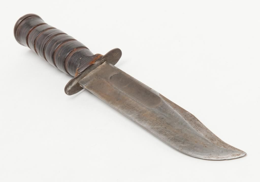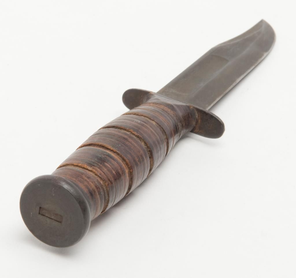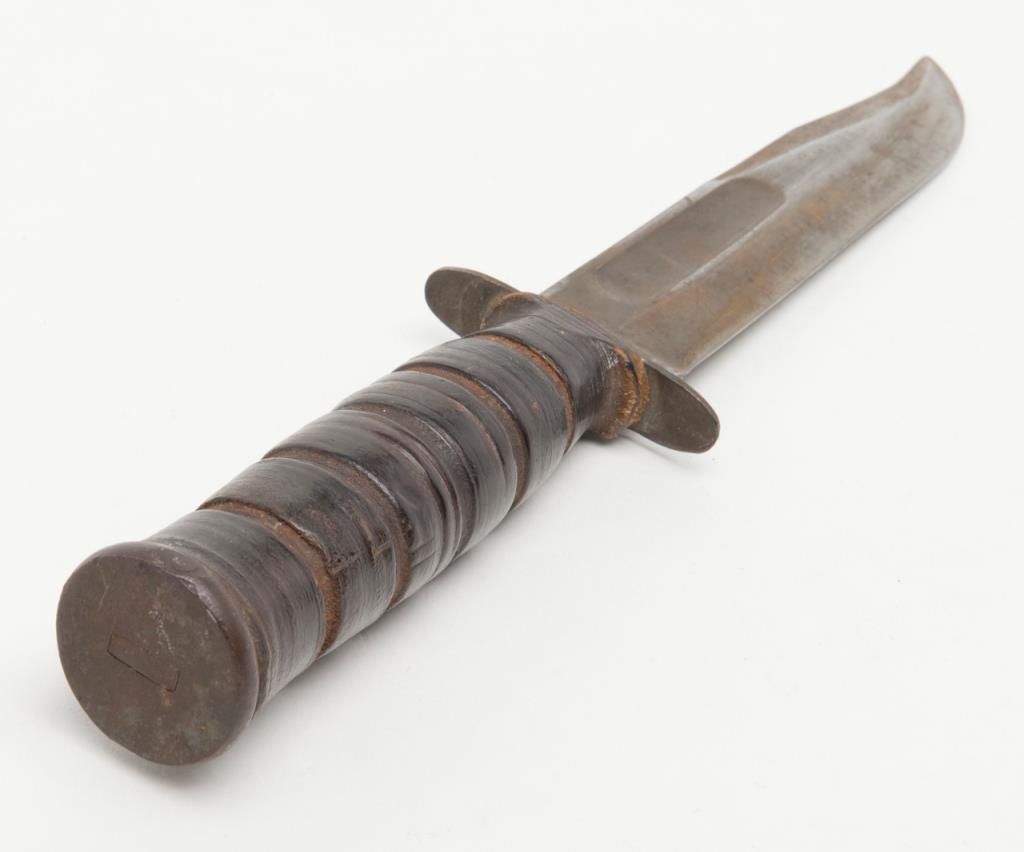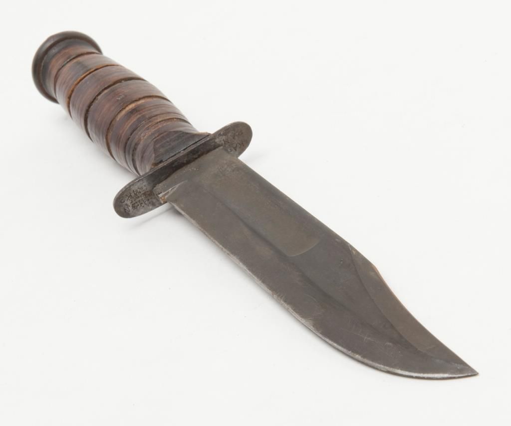 Lot of 2 KA-BAR style knives with leather sheaths, one marked “US UTICACUTCO” with black leather sheath marked on back “SCARBROUGH”; the other is a USN-marked KA-BAR with tan leather sheath marked “F.W. Kehr” on back of sheath; both in “bringback” condition with stacked leather grips. Est.: $100-$200.