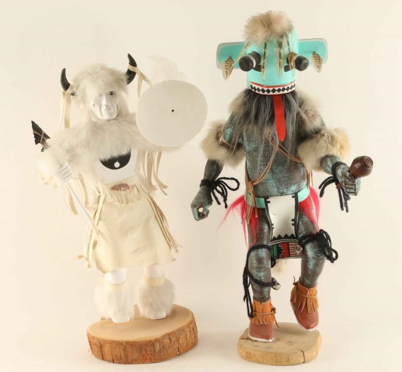 Both wood construction and hand painted on slab bases. White Buffalo with leather, fur and shell accents measures 16 1/2"h x 9"w. Blue Mudhead with feathr, fur, leather, yarn and jingle bell accents measures 18"h x 10"w.