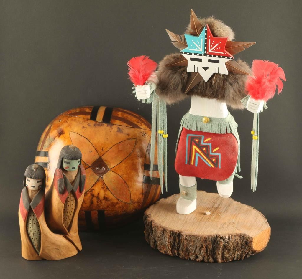 (1) Starface Kachina wood carved and hand painted with feather, fur, leather and shell decoration on natural wood base. Signed 'Vera Hudson' on bottom, measures 16 1/2"h x 9". (1) Hopi Kachina with two fiqures carved out of one piece of wood and hand painted. Signed by artist on bottom.Measures 8 1/4" h x 4 1/4" Also includes a bowl made from a gourd with painted star and floral motif. Measures 3 1/2"h x 10" dia