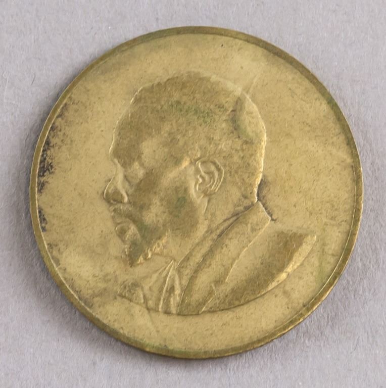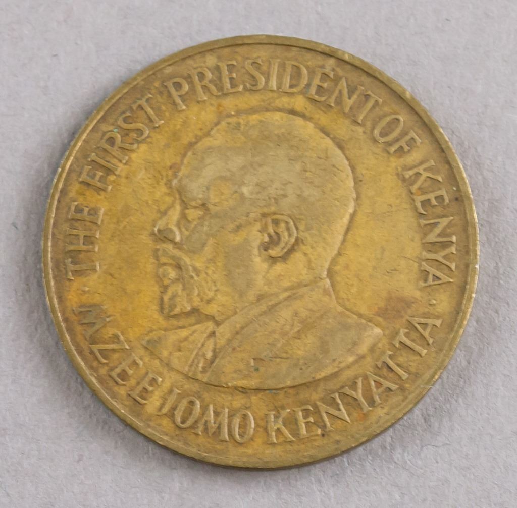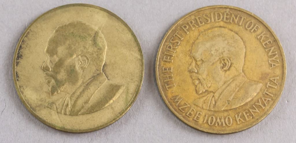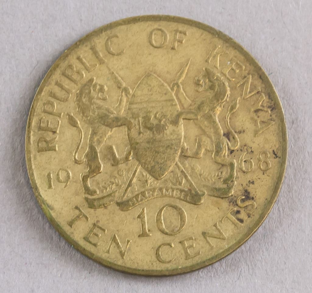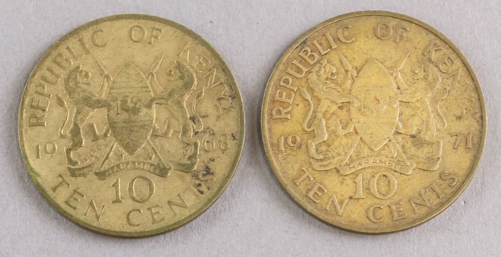 Lot of 2 Kenya coins. Issued 1968 and 1971. Obverse: National arms. Lettering: REPUBLIC OF KENYA / 1986/71 / 10 / TEN CENTS / HARAMBEE. Reverse: Bust facing left. No legend for 1968 coin. 1971 coin lettering: THE FIRST PRESEIDENT OF KENYA / MZEE JOMO KENYATTA.