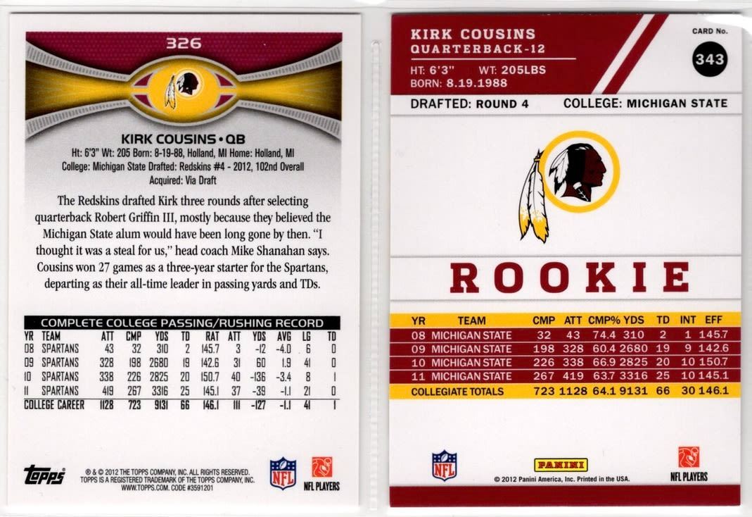 Lot of 2 Kirk Cousins Rookie Cards Panini Score #343 and Topps #326