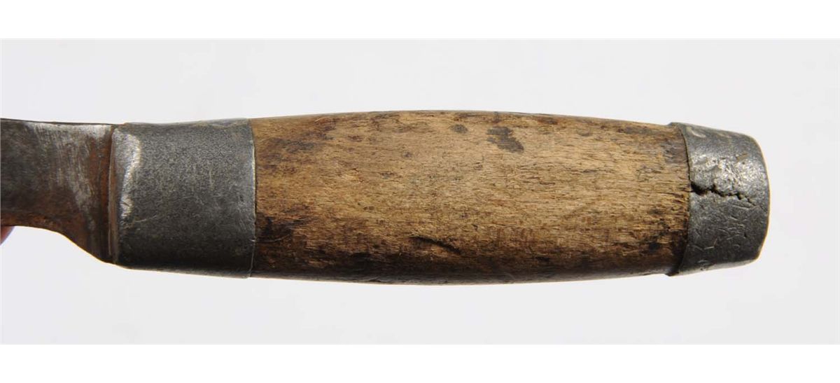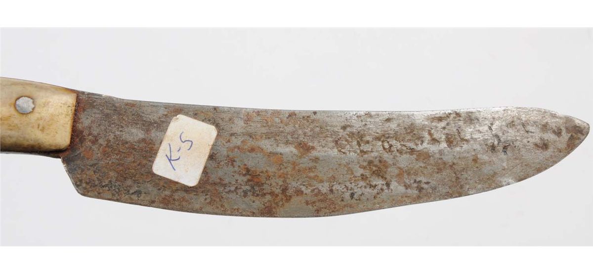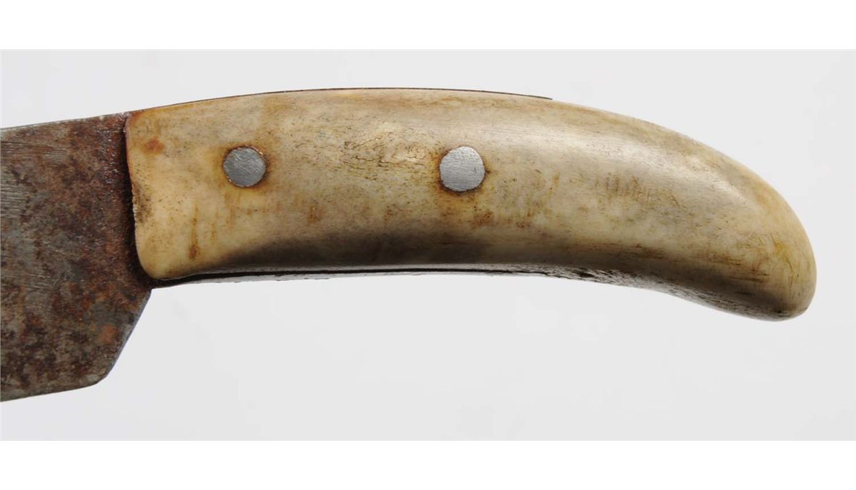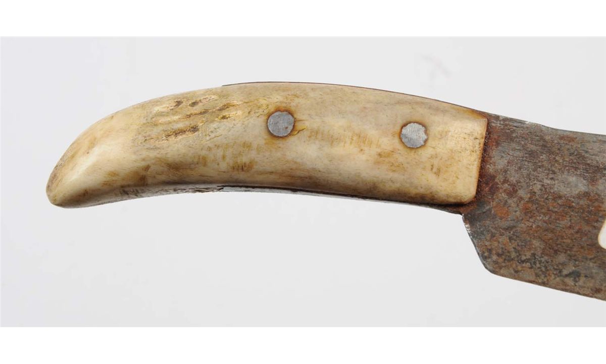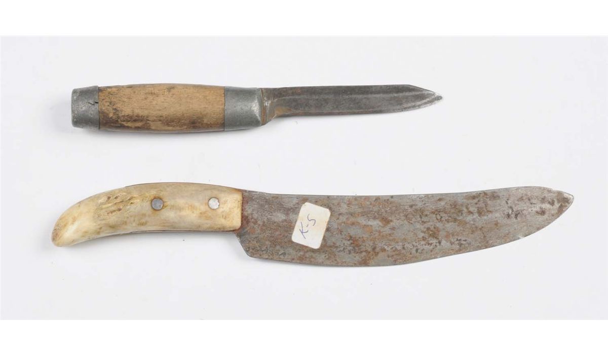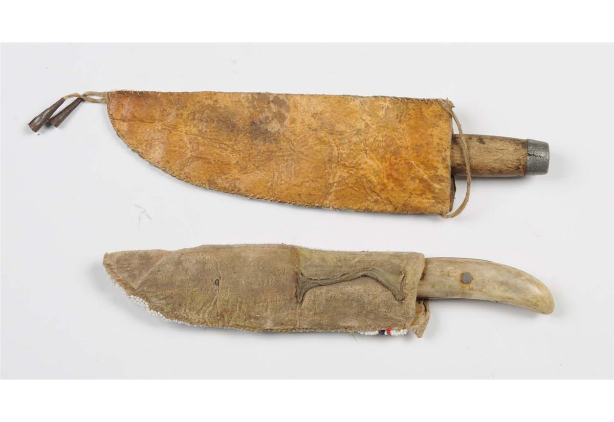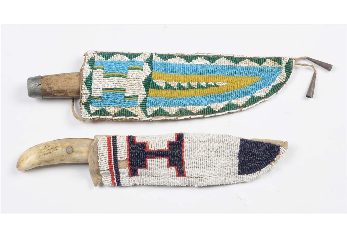 Lot includes: primitive knife with a 7" blade, overall is 11" , handle is smooth white bone. Rawhide sheath with finely stitched bead work done in red, white and blue, and an unsigned manufactured knife with wood handle and lead mounts. Blade measures 3 - 7/8", overall is 7 - 7/8". Rawhide sheath with finely stitched bead work done in green, white, blue and yellow. Circa 1900. Condition (Very Good).