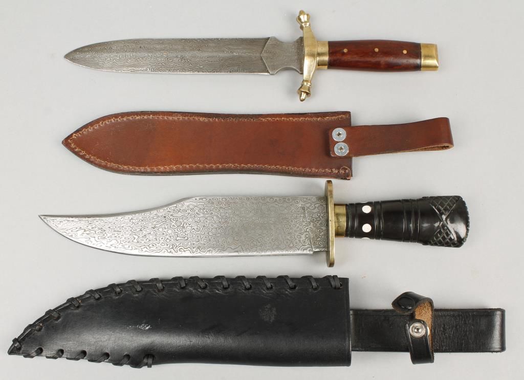 Including: 1 unmarked damascus dagger 12" overall with 8" blade has brass guard and point wood handle and leather scabbard, and 1 unmarked damascus bowie 13-1/2" overall with 9" blade brass point stiched leather scabbard.