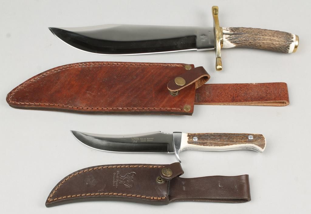 1 Whitetail Cutlery bowie style 14" overall with 9 1/2" blade brass guard, stag handle, leather scabbard, 1 Hen and Rooster 10" overall with 5 1/2" blade stag handle, leather scabbard.