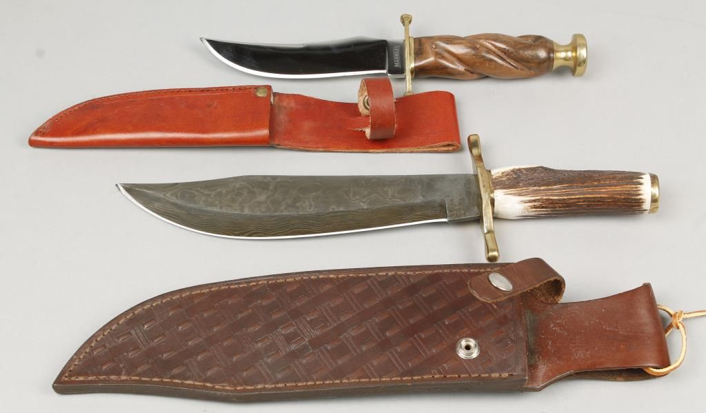1 Marbles bowie style with damascus blade 14" overall with 9-3/4" blade brass guard stag handle leather scabbard, 1 Marbles 10-1/2" with 6" blade brass guard and point twisted wood handle leather scabbard.