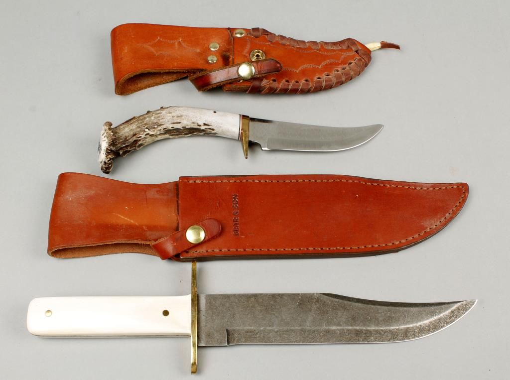1 is a Bear bowie style with damascus blade and bone handle, 14" overall 9" blade, with leather scabbard. The other is a handmade skinner style stag handle 10" overall with 5" blade, includes custom made scabbard.