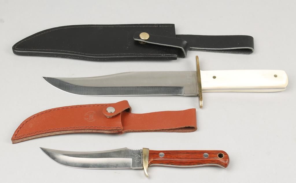 1 Bear bowie style 14" overall with 9" blade brass guard bone handle leather scabbard, and 1 Buck Creek 10" overall with 5-1/2" blade brass guard wood handle, leather scabbard.
