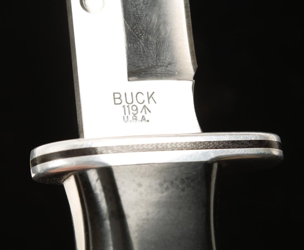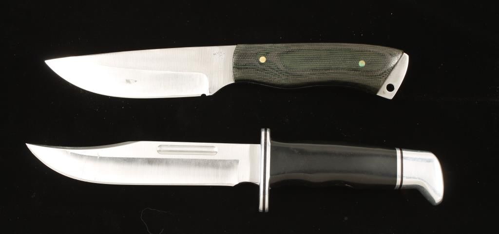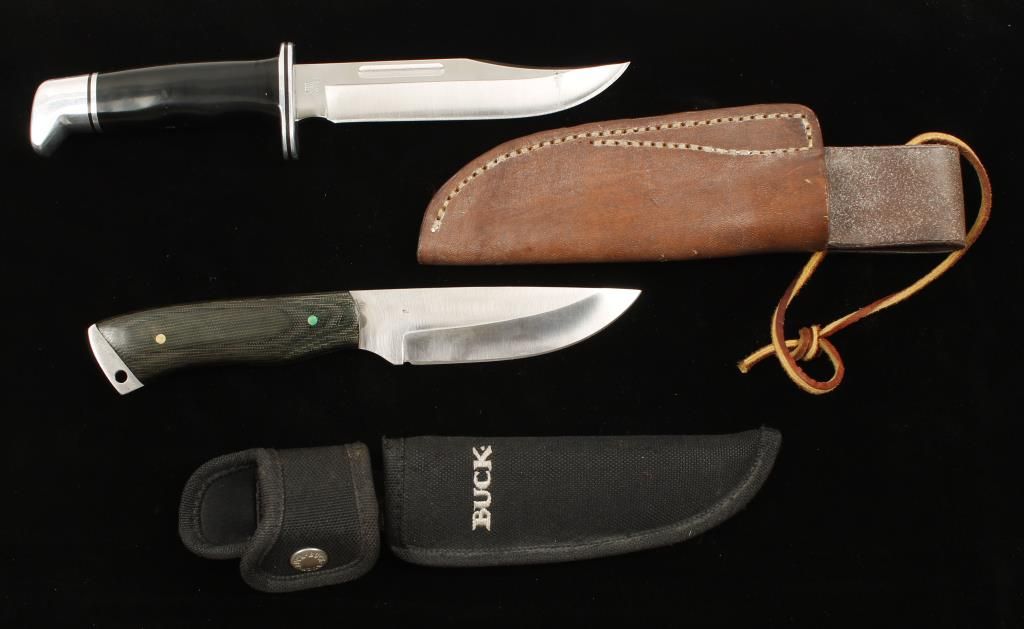 Includes Buck 119 fixed blade knife, 6" blade 10-1/2" overall with black nylon sheath and Custom fixed blade knife marked "HMXX" 4-3/4" blade 9-1/4" overall with custom leather sheath.