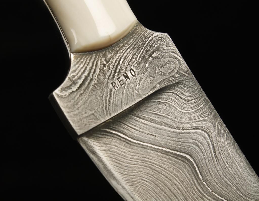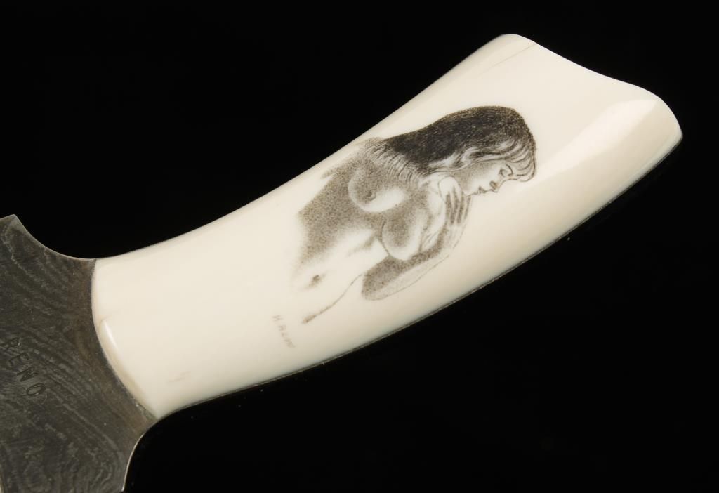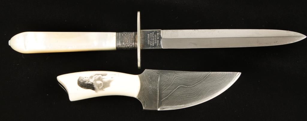 A K. Reno custom damascus 2.75" blade knife with Walrus ivory scales. The right scale is scrimshawed with a nude young lady from the navel up. Also a Joseph Allen & Sons "Non-XLL" 4.625" blade dirk from Sheffield , England. It has a mother of pearl handle.
