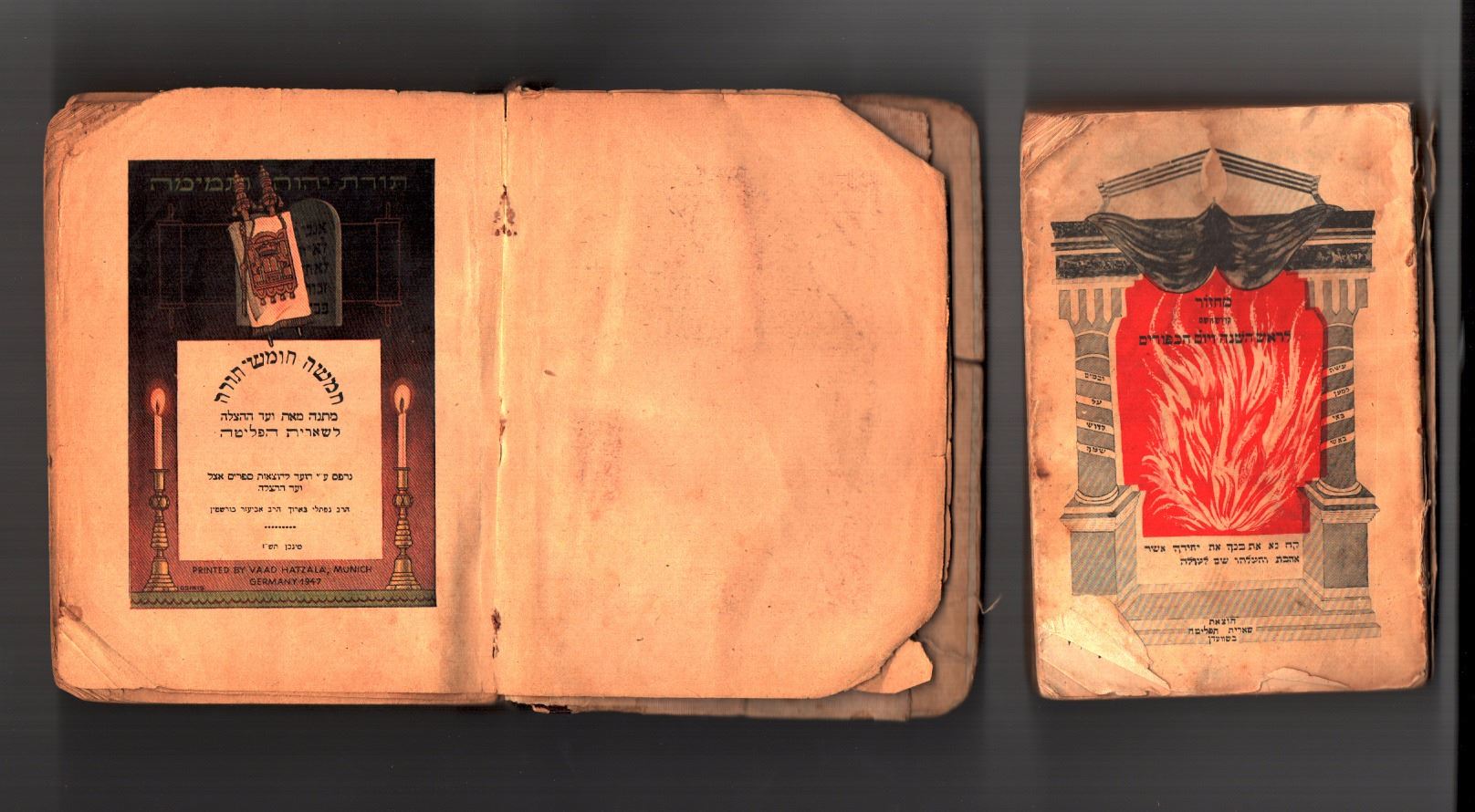 Lot of 2 Kodesh books printed by Sh'erit ha-Pletah: 1. Five books of the Torah, presented as a gift from Va'ad Hahatzala to Sh'erit ha-Pletah. Printed by the Book Publishing Committee of Va'ad Hahatzala. Munich, 1947. Chumash and Megillot Ruth, Eichah and Kohelet, with Rashi's commentary and Onkelos. With a thank-you letter to the American People and their president, from the rabbis of Va'ad Hahatzala, with a drawing of the US flag. Handwritten dedication. A colorful title page in lithographic print.